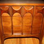 This is a Mid Century Modern Side End Table. It is in great condition, made of solid walnut and rosewood, and has dramatic design details.