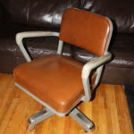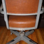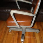 This is a Mid Century desk chair made by Columbia. It swivels and reclines. The seat and back vinyl are in excellent condition, with no tears or rips. It has great details such as streamlined steel base and steel castors over the wheels which are beautiful in design and protection. The chair wheels turn easily. Best of all it’s comfortable.