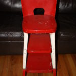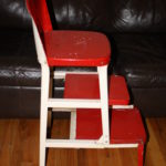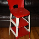 This is an antique bar stool step stool in good condition. It is made of solid steel, still has its original paint which looks great and two pull out steps that slide out easily. Very cool piece, can be used as a bar stool, step stool or accent piece in the kitchen.