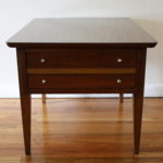 Mid Century Modern Lane Side End Table This is a mid century modern side end table by Lane in 1963. It has a solid wood base, formica top, very cool brass knobs, tapered legs. and one dovetailed drawer that pulls out easily. Dimensions: 29″D x 22″W x 20″H *SOLD* Leave a Reply Cancel replyYour email address will not be published. Required fields are marked *Comment * Name * Email * Website Save my name, email, and website in this browser for the next time I comment.