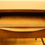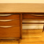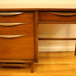 Mid Century Modern Desk with Sleek Wood Handles This a Mid Century Modern Desk that is made of solid wood. It has an mcm formica top and the signature tapered legs. It also has four dovetailed drawers that pull out easily and with a sleek wood drawer handles. Dimensions: 31″H x 48″W x 19″D *SOLD* Leave a Reply Cancel replyYour email address will not be published. Required fields are marked *Comment * Name * Email * Website Save my name, email, and website in this browser for the next time I comment.