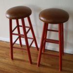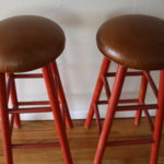 These are (2) Antique Farm Stools in great condition. The bases are made of solid wood and are very sturdy. The seats have been professionally reupholstered with high end upholstery grade leather and seating materials.