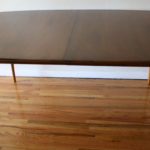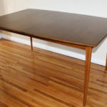 This is a Mid Century Modern dining table made of solid wood.  It has a beautiful simple design with sleek tapered legs.  No leaf.