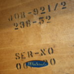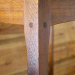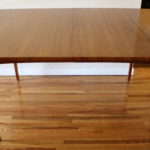 This is a Mid Century Modern dining table from J.B. Van Sciver. It is made of solid wood and has a beautiful juxtaposed wood design along the edges. Its sleek tapered legs have a cut wood dowel design at the base. No leaf.