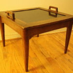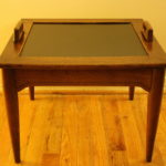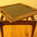 This is a mid century modern side table with a removable tray for serving.  The table base is made of solid wood and has tapered legs.  The tray has solid wood frame and a black formica center.  The tray lifts above the handles easily making it a wonderful stylish serving piece.  A rare cool piece!