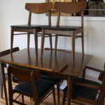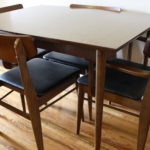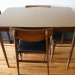 This is a mid century modern dining table that is solid wood with an mcm formica top.  It has an extension leaf and beautiful tapered legs. The sides of the table curve out a little, adding a nice accent to its design.  The chairs are sold.