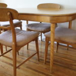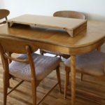 This is a mid century modern dining set in the style of Heywood Wakefield with the lighter blond wood and beautiful curves. The set includes a solid wood dining table with tapered legs, an extension leaf, and 4 upholstered solid wood chairs. There are 3 side chairs and 1 arm chair which is reflected in the price. The entire set is in great condition.