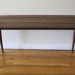 This is a Danish coffee table bench made and signed by A.R. Longaker in 1961. It is made of solid wood and is in excellent condition. It has the beautiful wood grain slats, tapered legs and brass feet. Gorgeous piece and awesome to own.