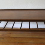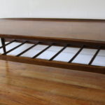 This is a mid century modern coffee table from Bassett’s Artisan collection.  It was made in the 1960’s and has the Danish modern style with surfboard edges found in early Mobler pieces.  The table is made of solid walnut, has a magazine rack, and tapered legs.