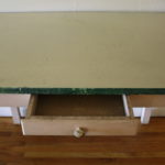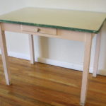 This is an antique enamel top farmhouse table in beautiful condition. The top is enamel coated steel and the base is all solid wood. There is one drawer that pulls open easily. Great rustic look for a kitchen table, dining table or desk.