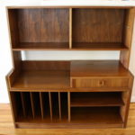 This is a mid century modern expanding media bookcase desk unit.  One of the coolest pieces we have had so far, this unit has a bookshelf hutch with adjustable shelves, a desk, or a record player with slats on the bottom for files or records.  There are also bottom shelves and a drawer.  This unit expands to fit your spacial needs.