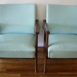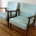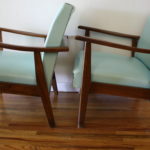 Mid Century Modern Turquoise Chairs with Brass Tack Detail This is a pair of mid century modern chairs with solid wood frames and turquoise naugahyde. They have a beautiful brass tack detail and gorgeous lines. Dimensions: Seat width: 24″, seat depth: 18.5″, seat height”12″, back height: 30″ *SOLD* Leave a Reply Cancel replyYour email address will not be published. Required fields are marked *Comment * Name * Email * Website Save my name, email, and website in this browser for the next time I comment.