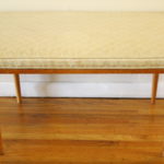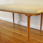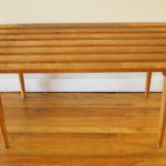 This is a mid century modern slatted wood bench with a cushion.  Can be used as a bench or a coffee table, this piece is perfect for small spaces and has a great design.  The cushion cover is removable and can be cleaned.