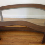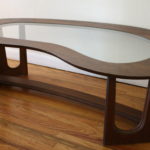 This is a mid century modern coffee table with a glass top. It has a unique kidney shape with a really cool solid wood sculpted base.