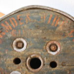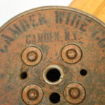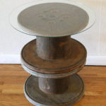 This is an antique industrial spool table from the Camden Wire Co. in New York. This side table is made of 2 mini wooden spools used to hold wire. Each spool has a great patina, distinctive marks and rimmed with metal. There is an optional glass top that comes with it.