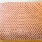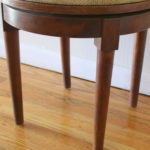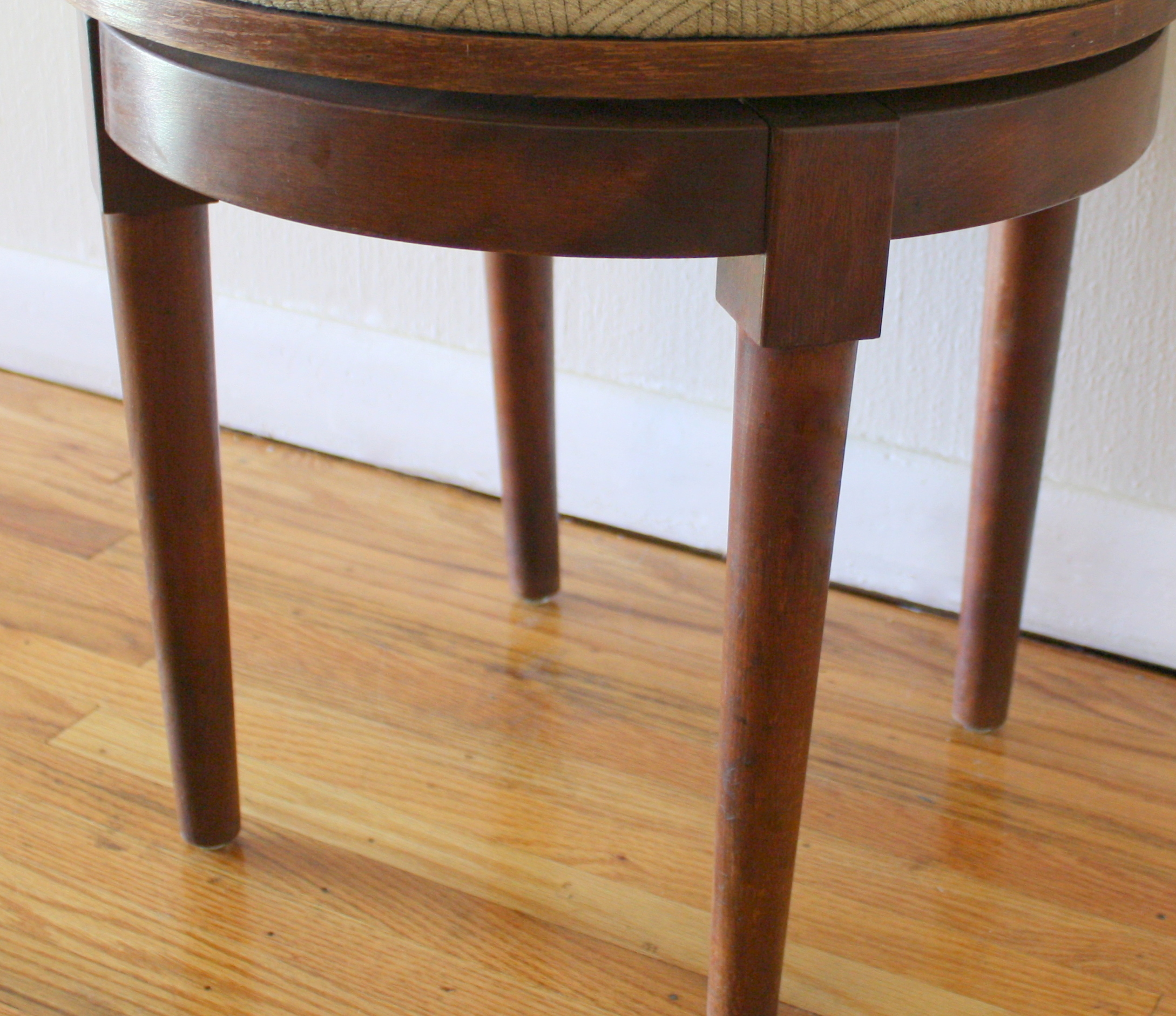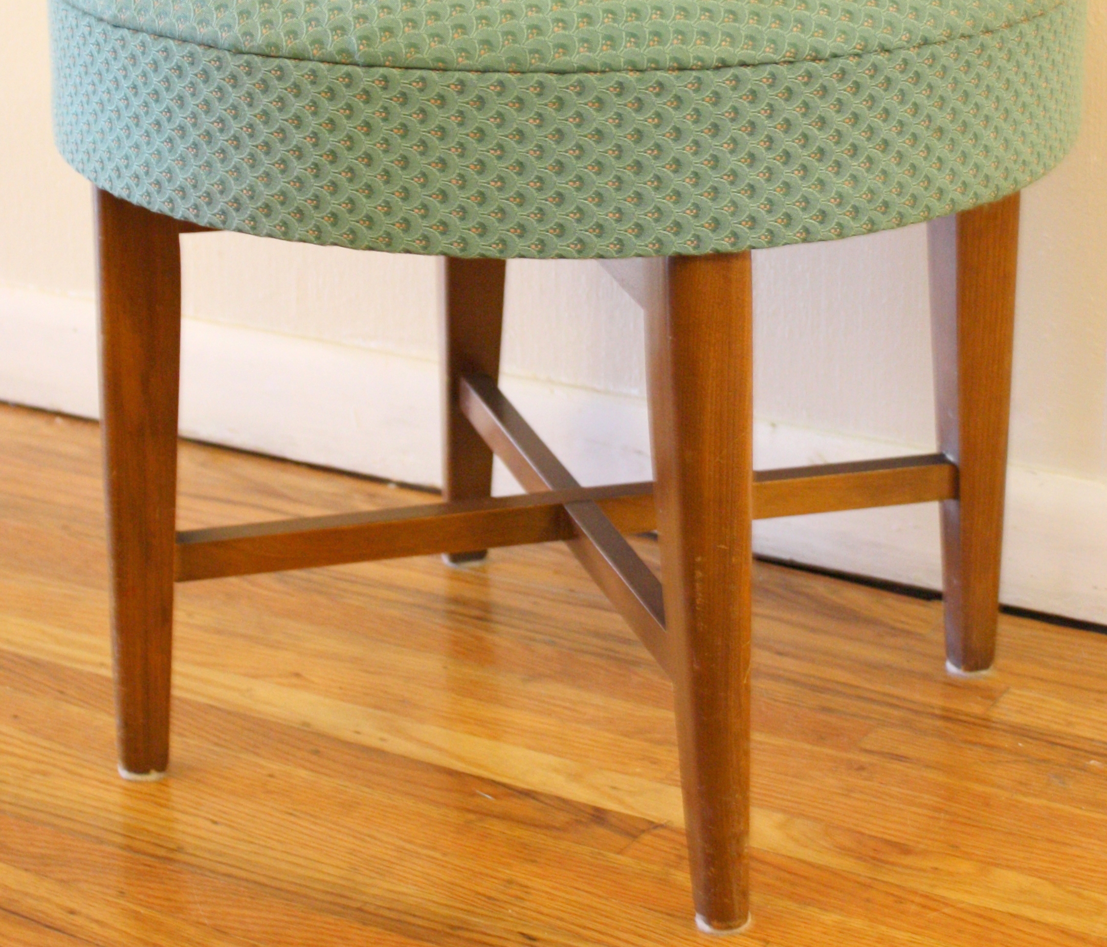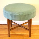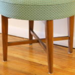 These are three upholstered ottomans with great patterns and solid wood legs and frames. There are two mid century modern ottomans. One mcm ottoman has a turquoise green patterned fabric and a tapered cross leg design. The other mcm ottoman has a seagrass colored fabric, tapered legs and swivels. The third ottoman is a vintage piece with an interesting pink scale fabric and curvaceous Queen Anne legs.