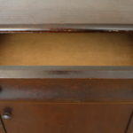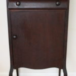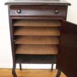 This is an antique empire mahogany record cabinet with cabriole legs. It is made of solid wood, has a small top drawer and 5 shelves inside its cabinet. Classic clean design, perfect for your favorite vinyls.
