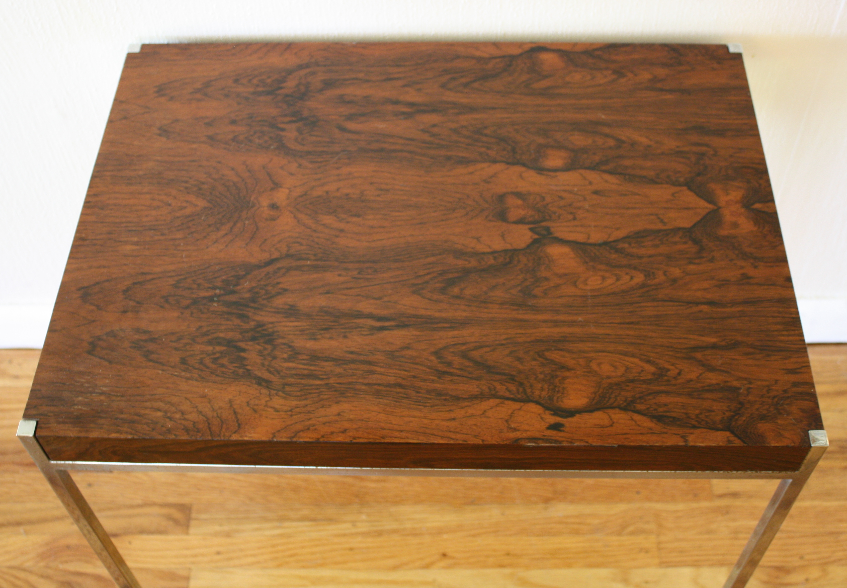 Mid Century Modern Side End Table Milo Baughman Style This is a mid century modern side end table in the style of Milo Baughman. It has a chrome base and wood top with a gorgeous wood grain. Simple and beautiful, made in Italy. Dimensions: 22″W x 16″D x 20″H *SOLD* Leave a Reply Cancel replyYour email address will not be published. Required fields are marked *Comment * Name * Email * Website Save my name, email, and website in this browser for the next time I comment.