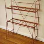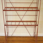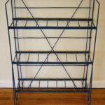 These are two antique magazine racks made of metal.  The blue magazine rack has a great industrial look and utility.  The red rack has a great pop of color.  The shelves are removable, and the racks are collapsible for transport and storage.