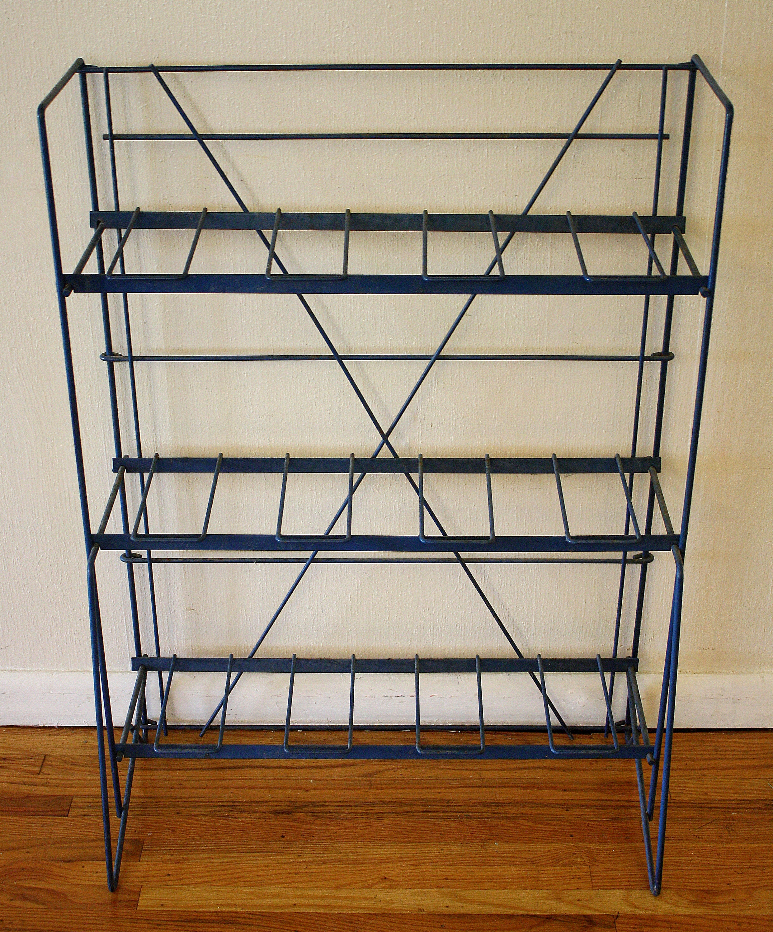 These are two antique magazine racks made of metal.  The blue magazine rack has a great industrial look and utility.  The red rack has a great pop of color.  The shelves are removable, and the racks are collapsible for transport and storage.