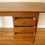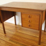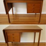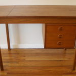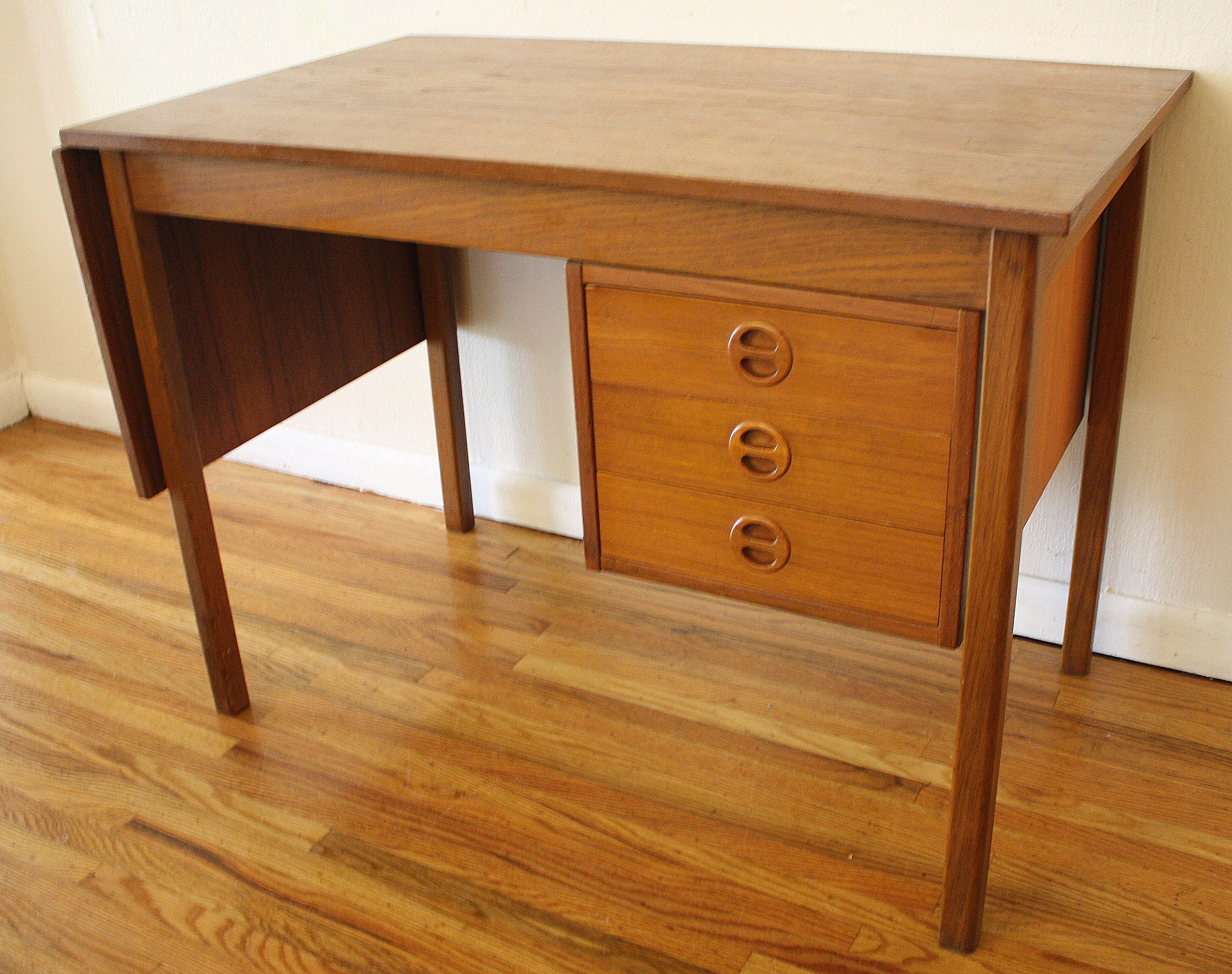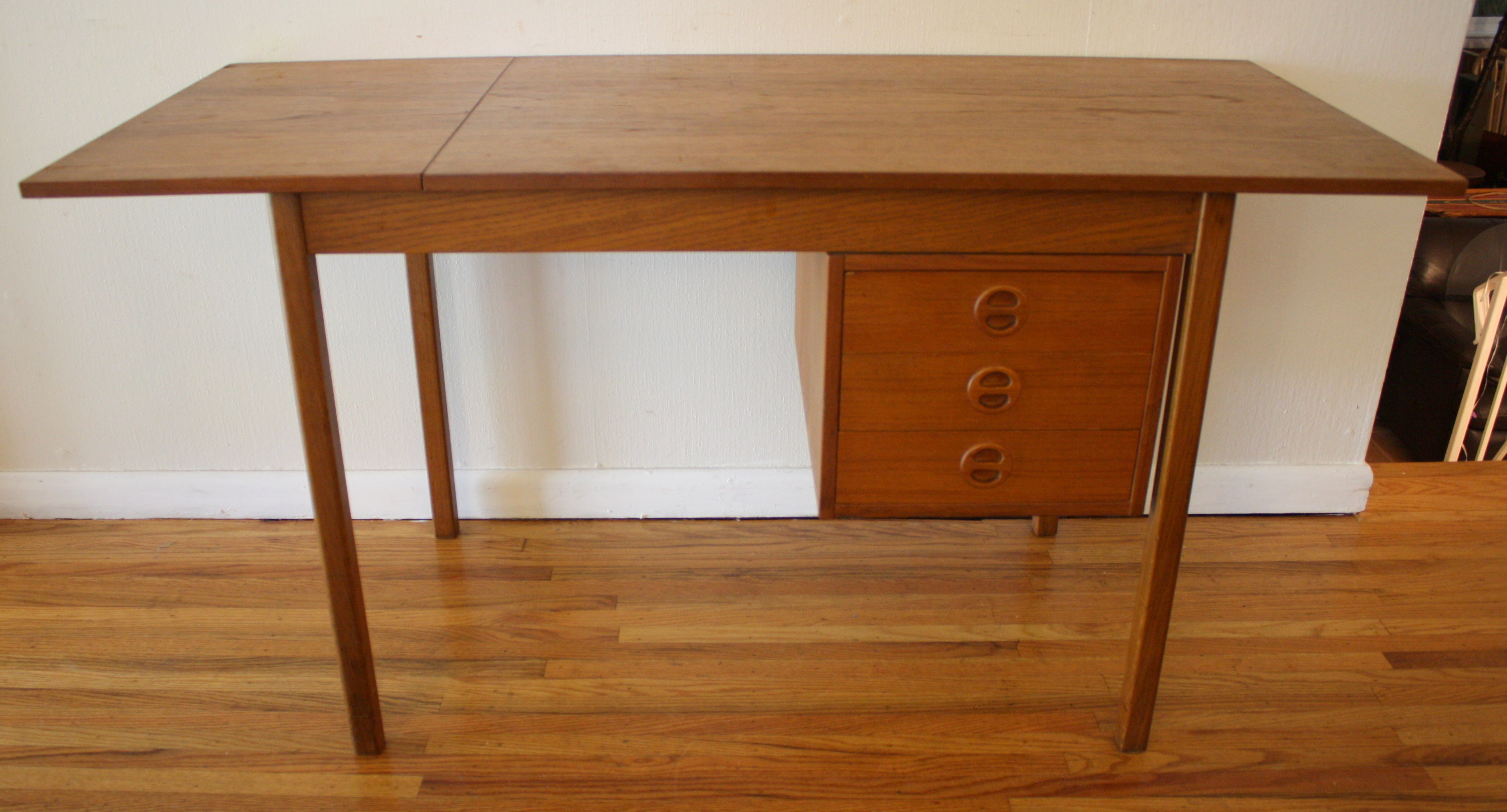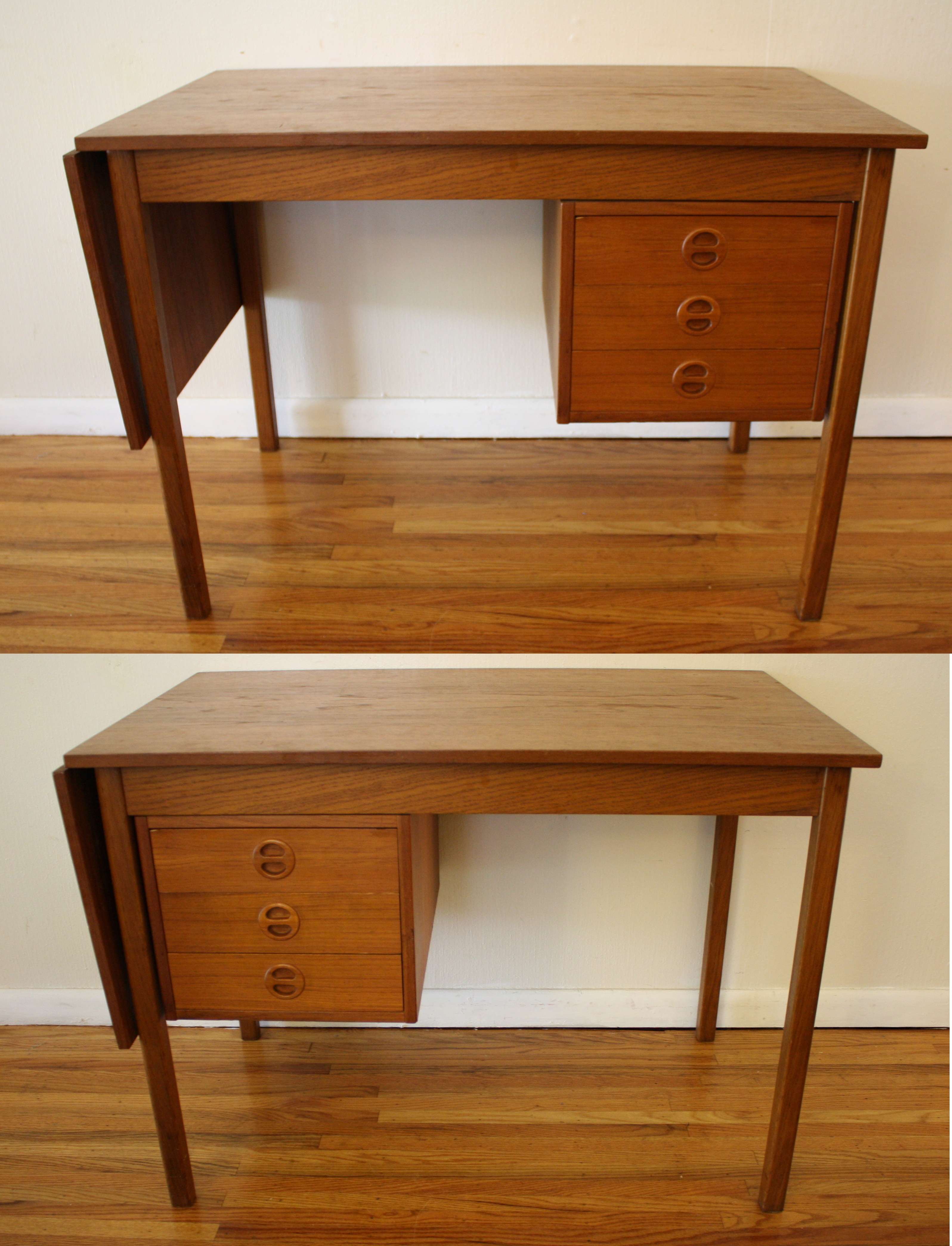 This is a mid century modern Danish style sliding adjustable desk. Unique in design, this desk can adjust for the right or left handed preference. There is a folding leaf that adds additional desk space if needed. There are three drawers in the adjustable desk compartment. A small piece of veneer has been repaired on the side of the desk.