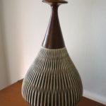 This is a mid century modern pottery lamp. It is a rich warm color with a woven design. It comes with a retro cream lampshade that accents the lamp’s design and adds to its illumination.