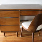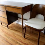 Mid Century Modern Desk and Chair This is a mid century modern desk and chair. It has 4 dovetailed drawers, tapered legs and a formica top. The mid century modern chair has tapered legs, a cut out design, and an upholstered white naugahyde seat. *SOLD* Leave a Reply Cancel replyYour email address will not be published. Required fields are marked *Comment * Name * Email * Website Save my name, email, and website in this browser for the next time I comment.