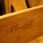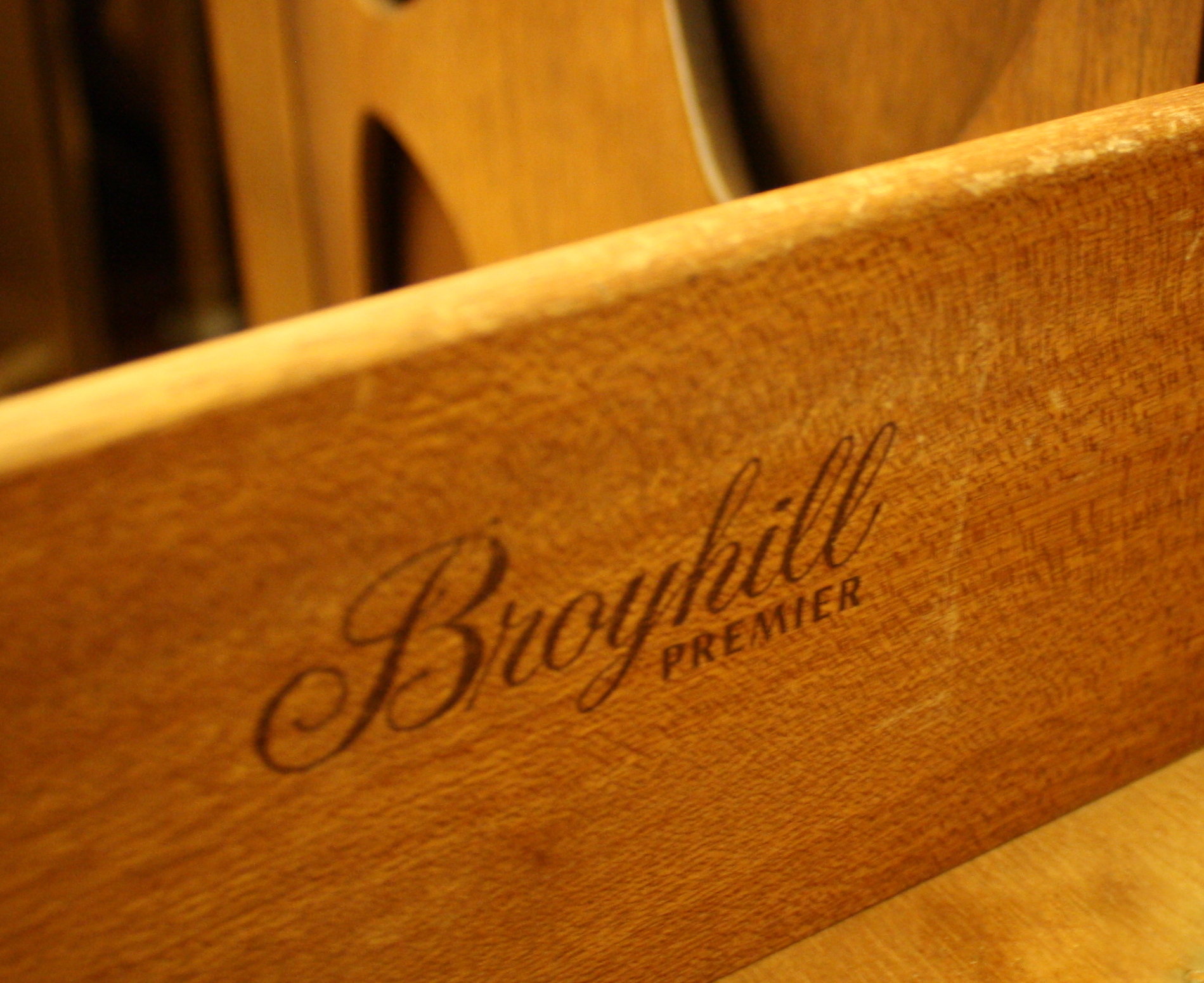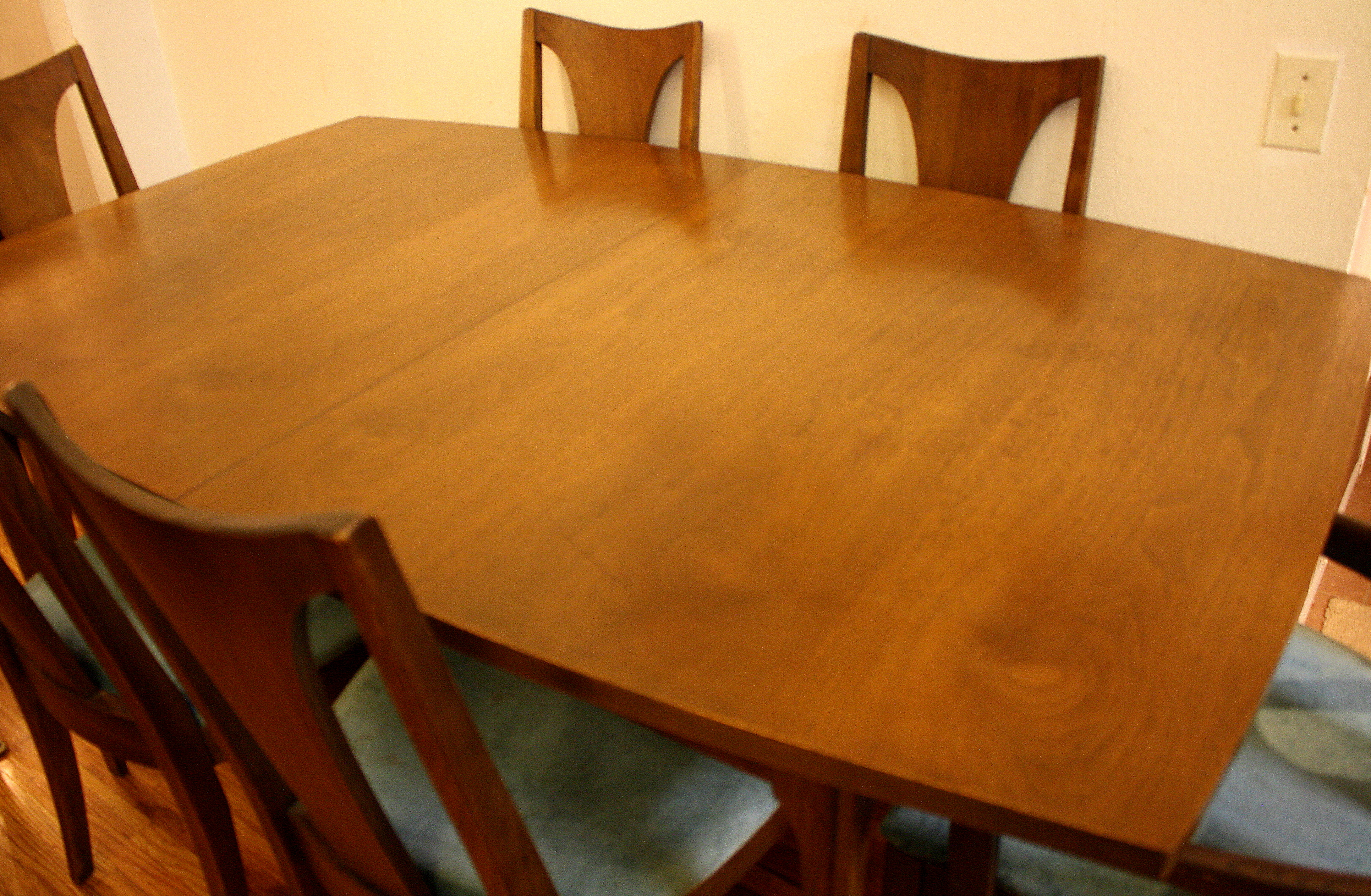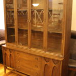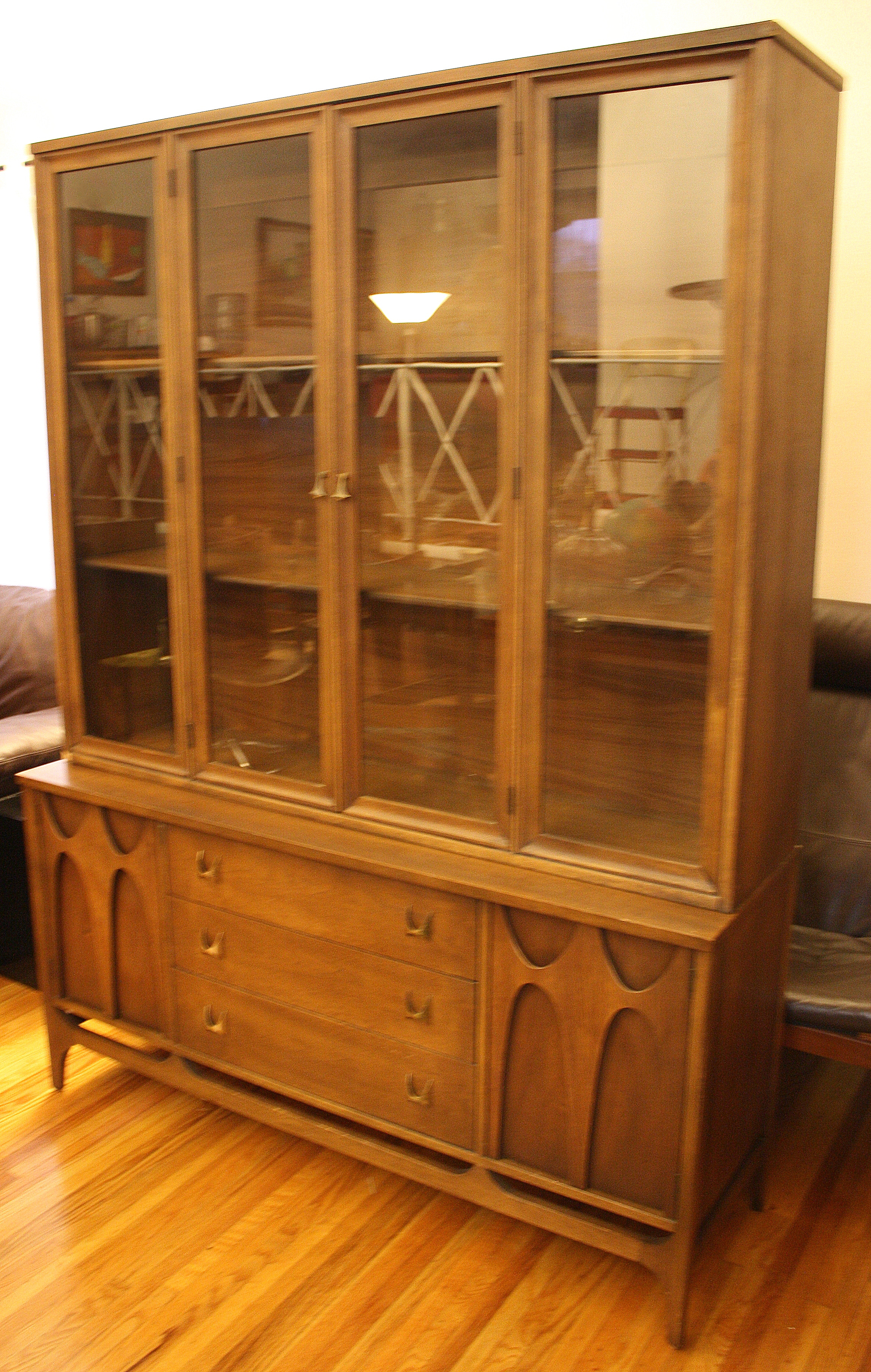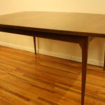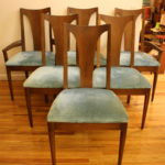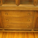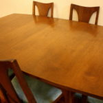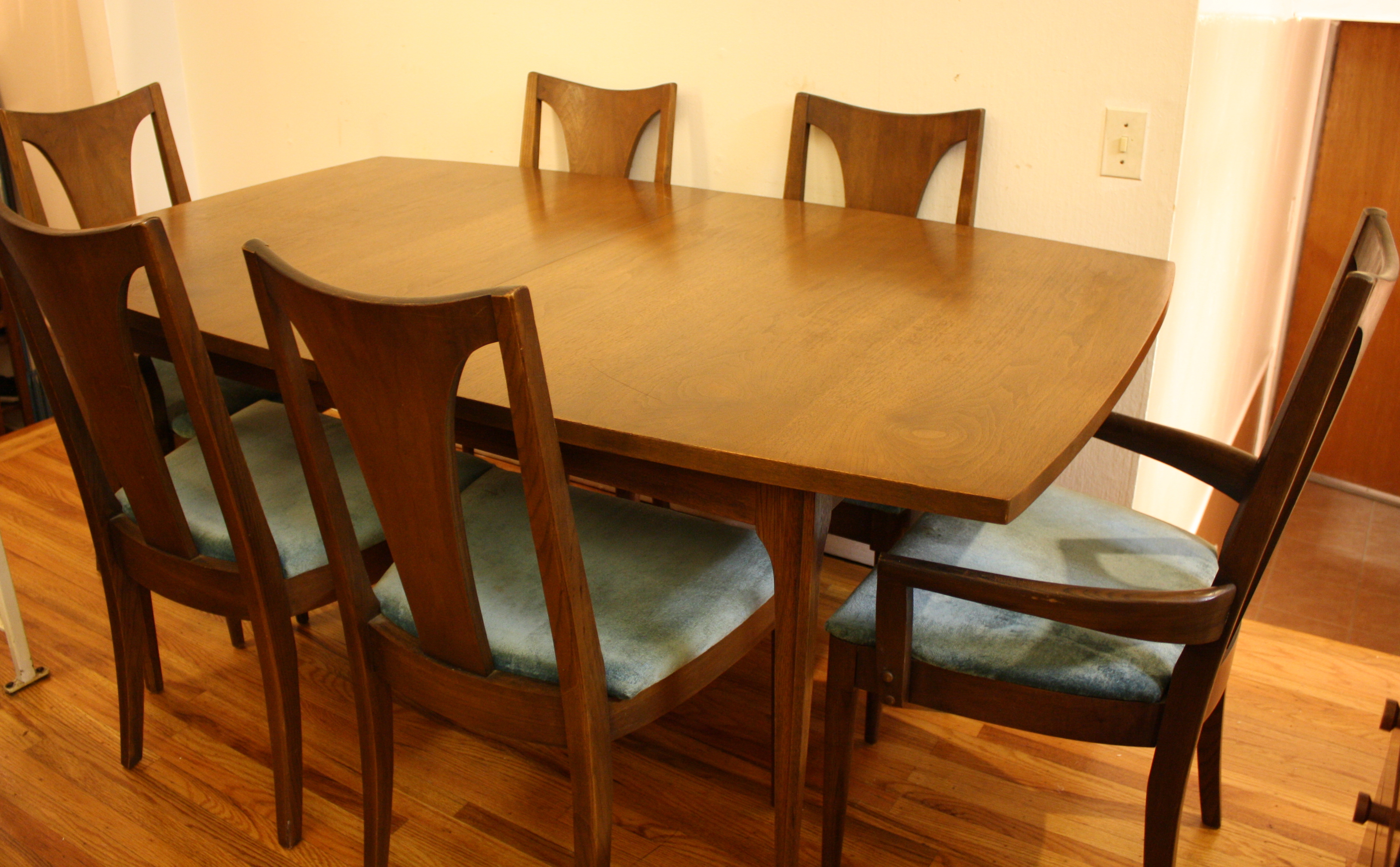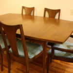 This is a mid century modern dining table with six chairs. It is from the Broyhill Brasilia line. The table and chairs are made of solid wood. There are 2 arm chairs and 4 side chairs with gorgeous sculpted frames. The table has tapered legs and 2 extension leaves. The china cabinet has the signature sculpted arch design, brass drawer pulls on dovetailed drawers and side compartments.