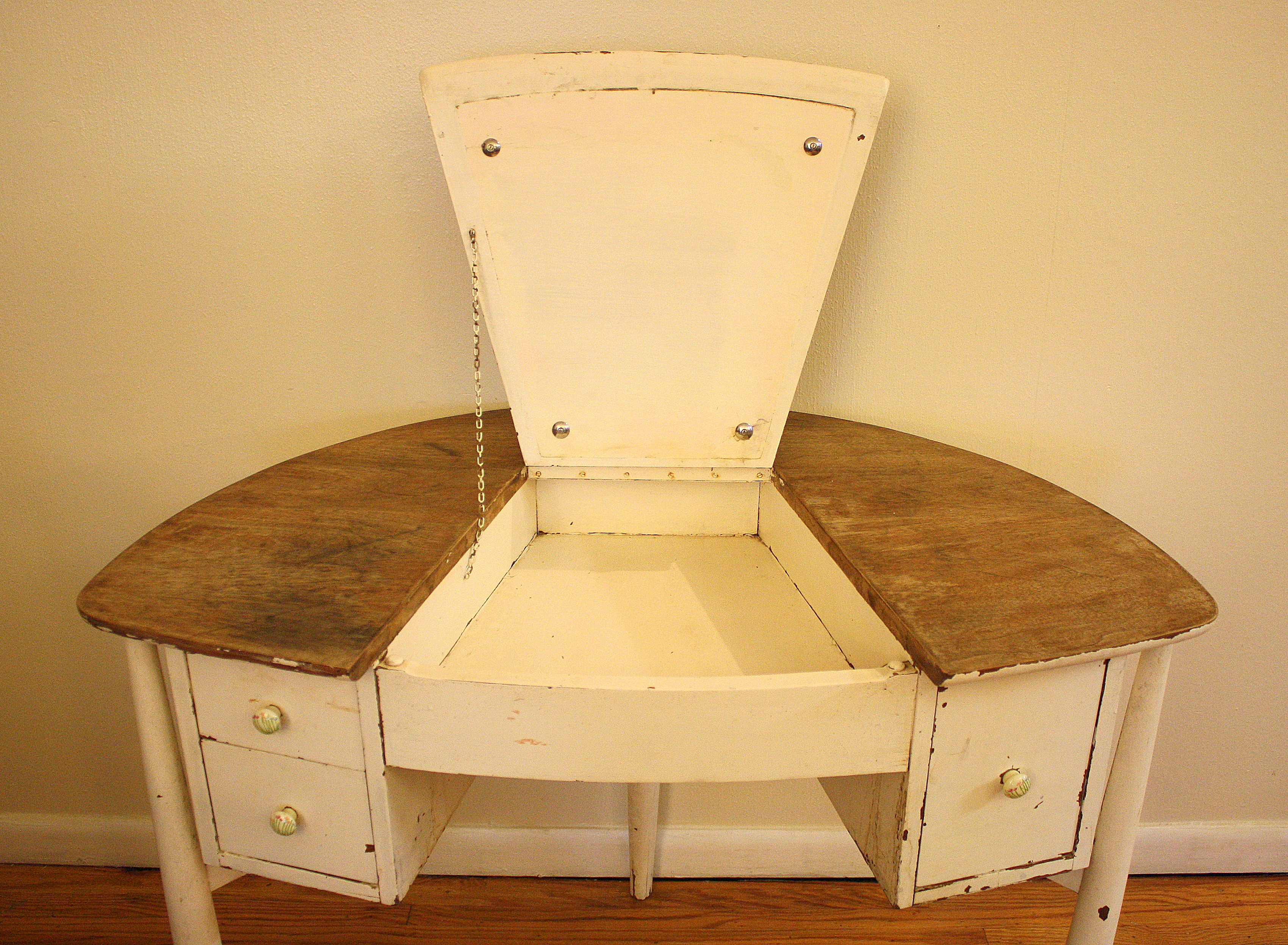 This is an antique vanity with a fliptop storage compartment. It has a great unique shape and a beautiful patina.  Great for a shabby chic console table.