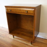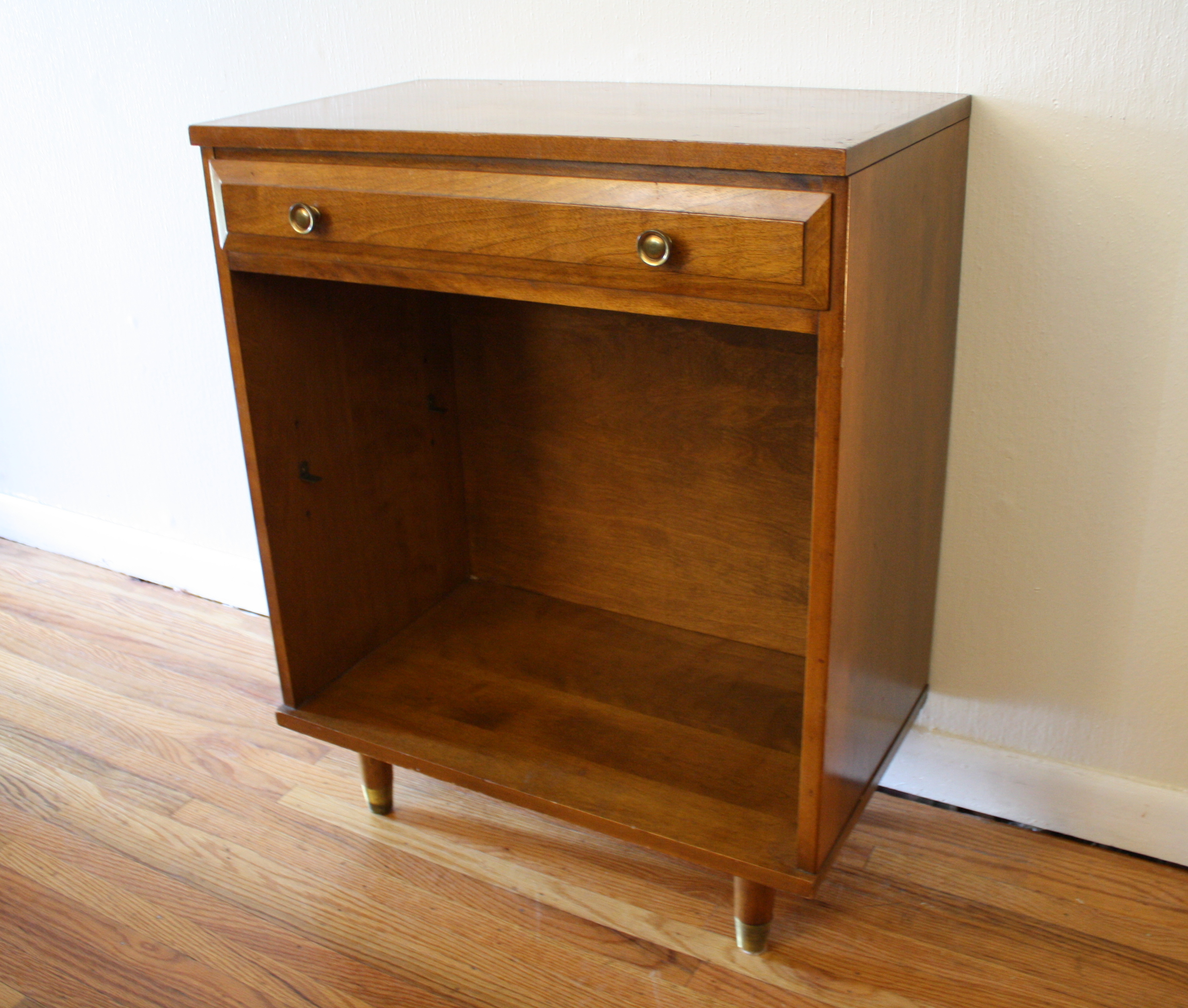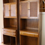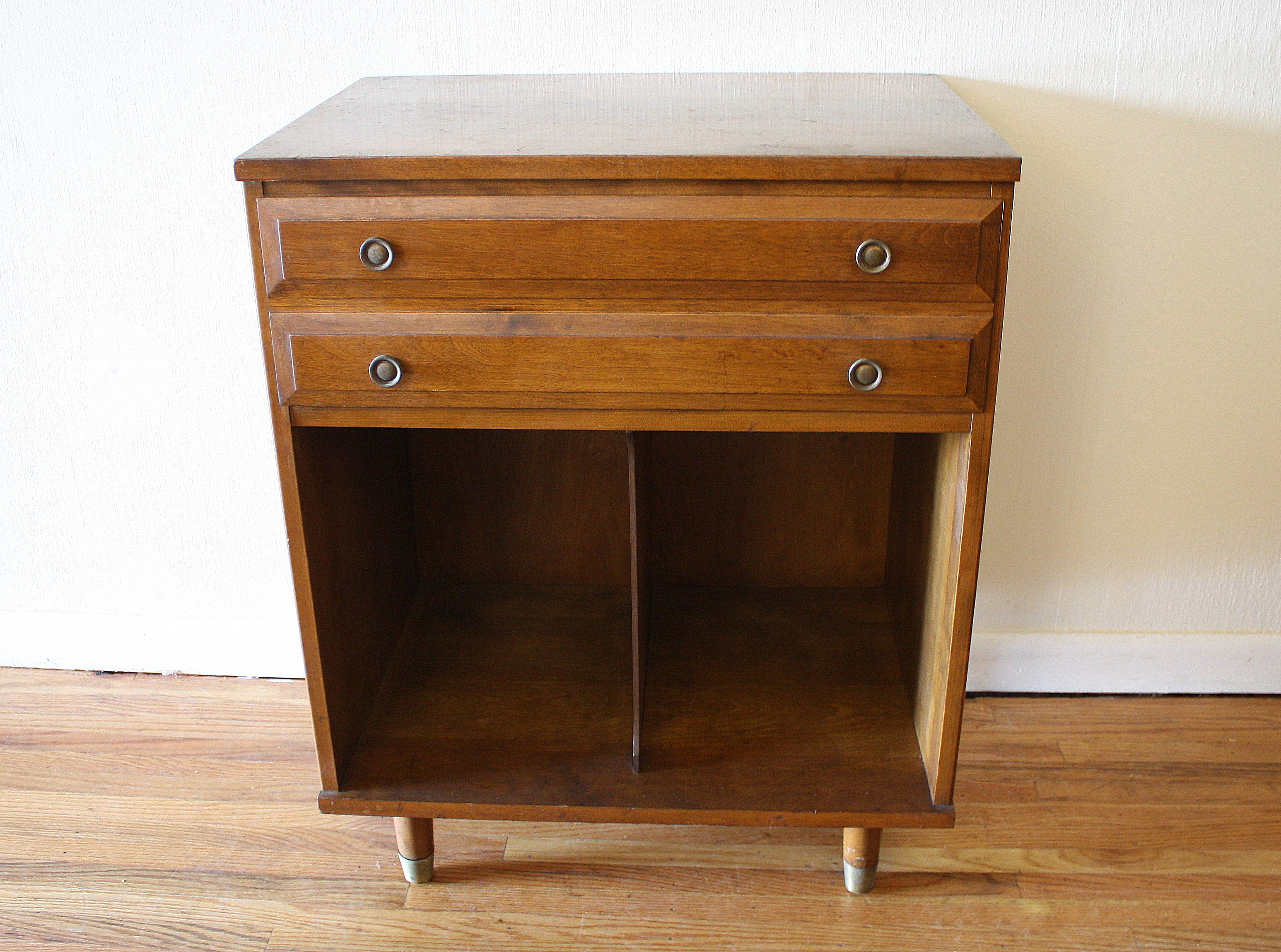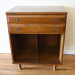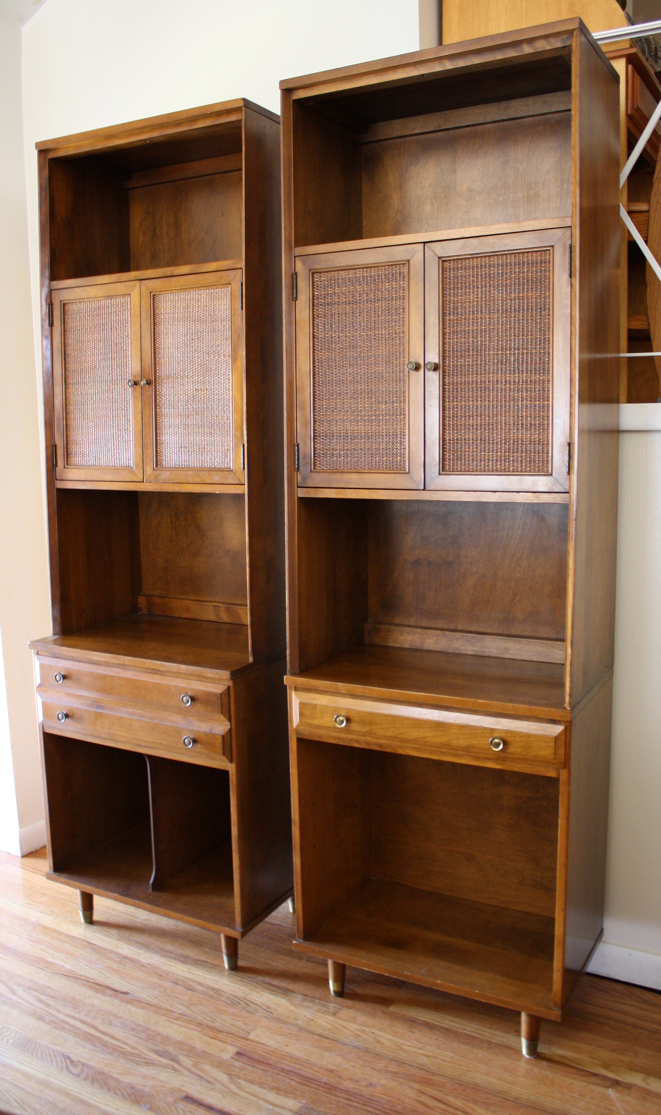 These pieces are from the Baumritter Roommates Collection.  The top bookshelf cabinets are removable and have a covered compartment with doors, perfect for storing some mini bar essentials.  The bottom side tables can be 1 of 3 combinations: a record shelf with drawer, a three drawer side end table, or a side table with a drawer and removable bottom shelf .  The pic is shown without the bottom shelf, can be used for storing taller items.  Very versatile and cool style.  All 3 side tables can also be sold separately, there are 2 top shelf pieces available.