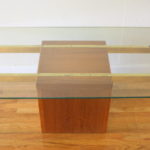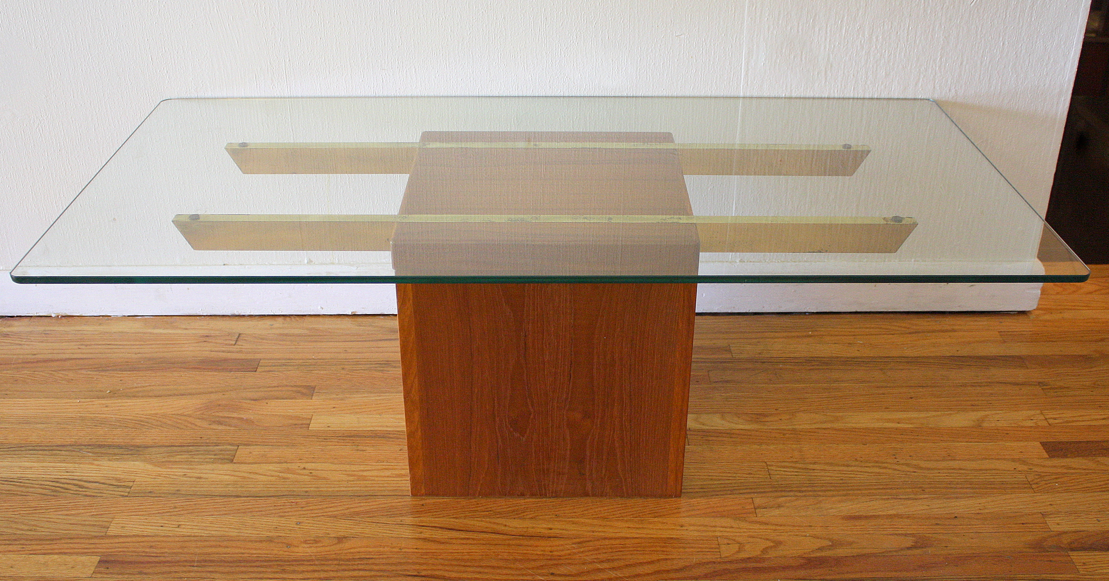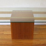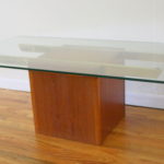 This is a Danish glass topped coffee table with a teak block base, marked Made in Denmark.  Great coffee table to show off beautiful wood floors or a gorgeous rug.  Dimensions: 47″W x 21″D x 15″H