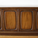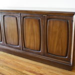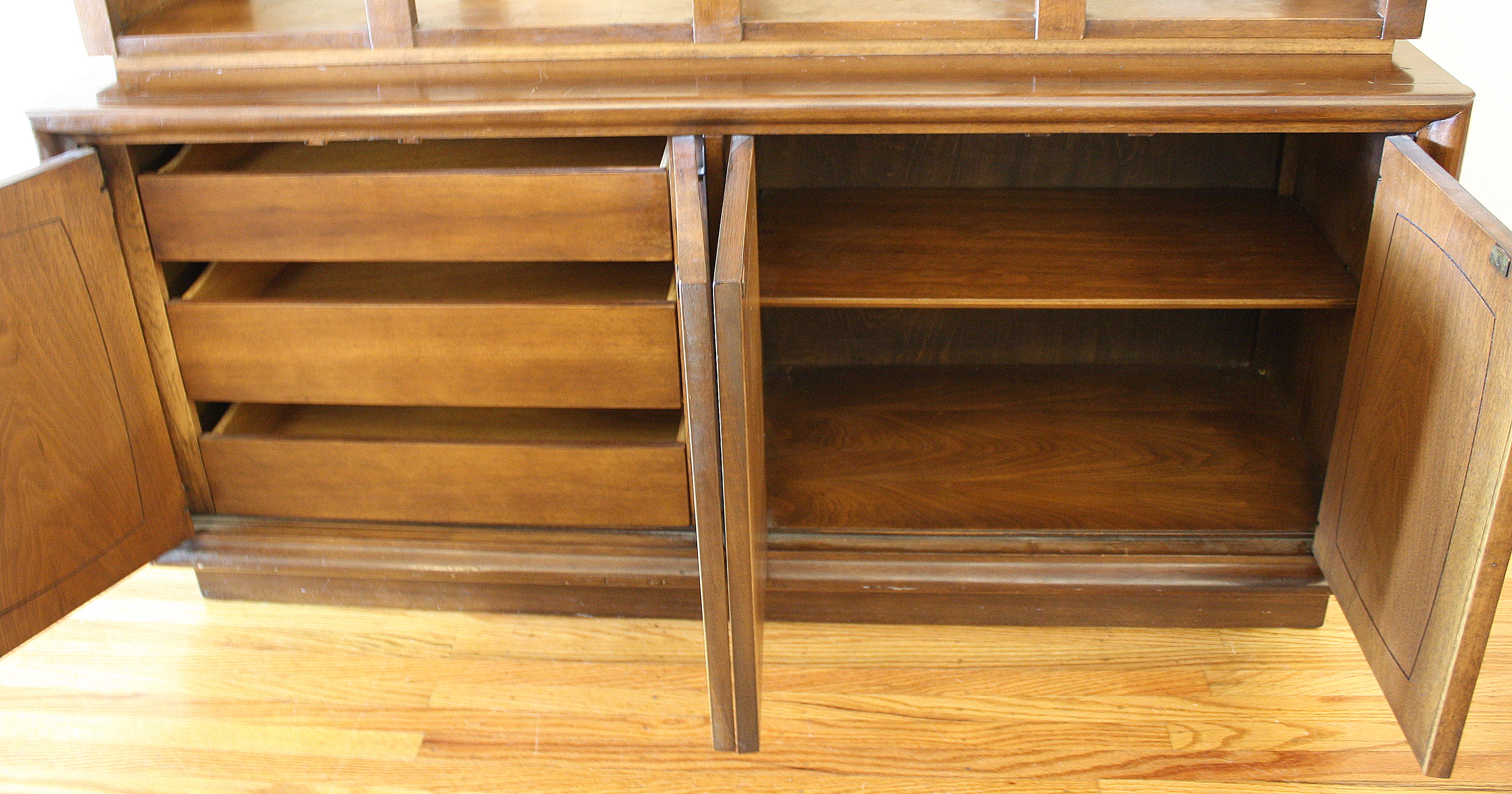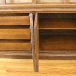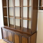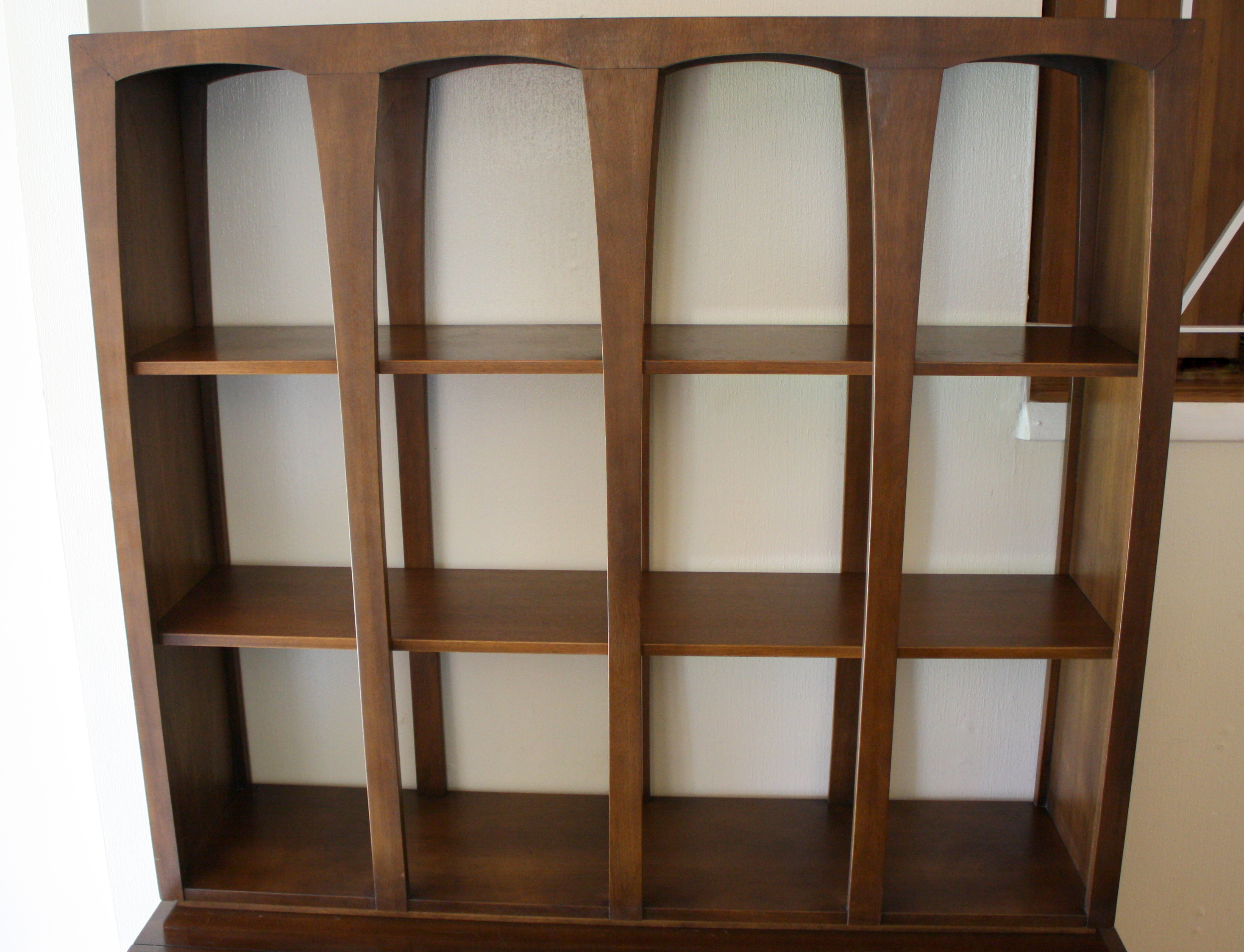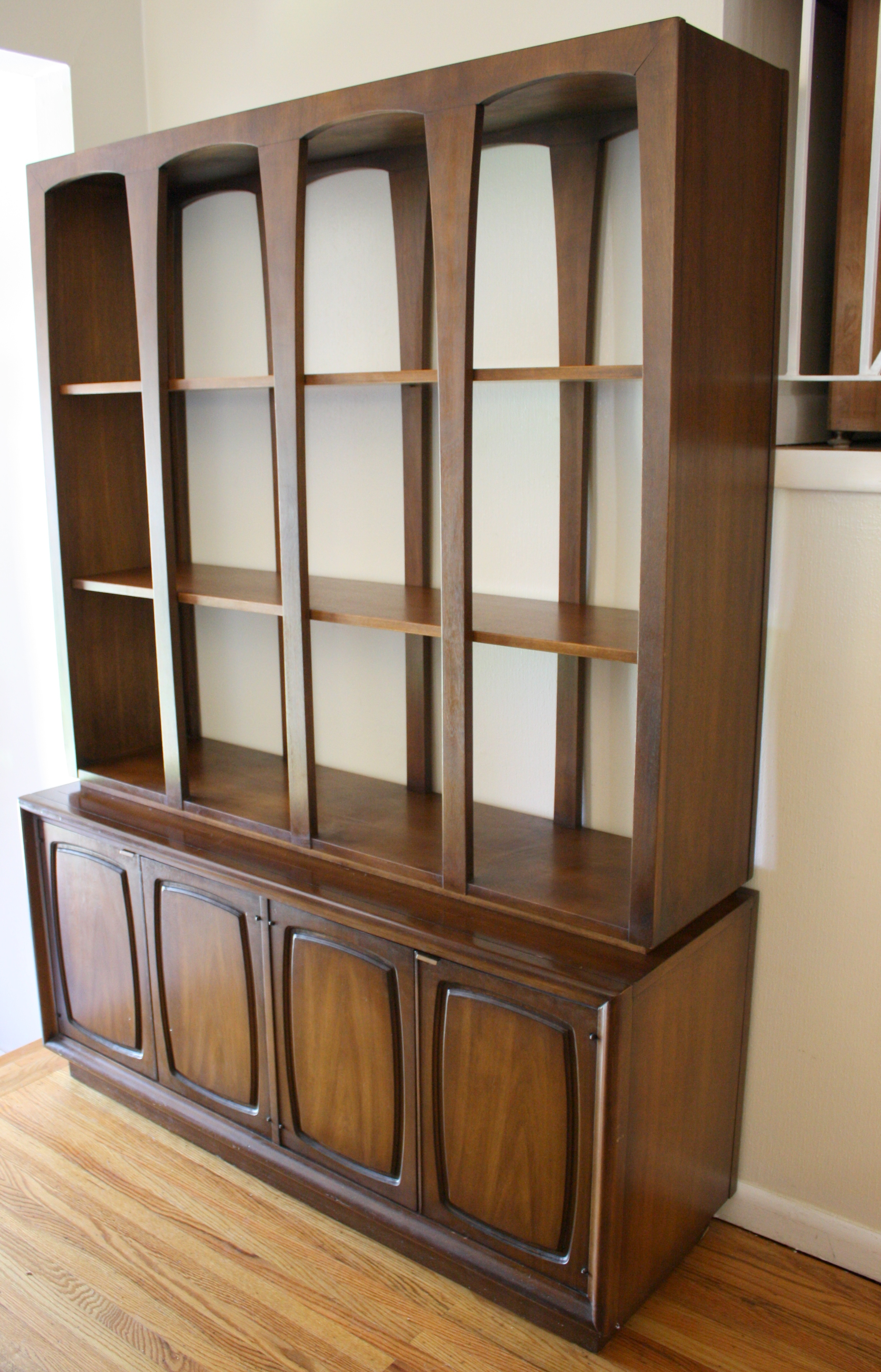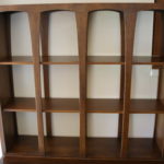This is a Broyhill Emphasis room divider. It comes in two pieces: a bookshelf with sculpted arches and a credenza. It can be used as one unit or utilized separately. The credenza has cabinets with shelves and drawers. Credenza dimensions: 54″W x 18″D x 25″H
