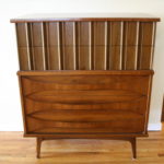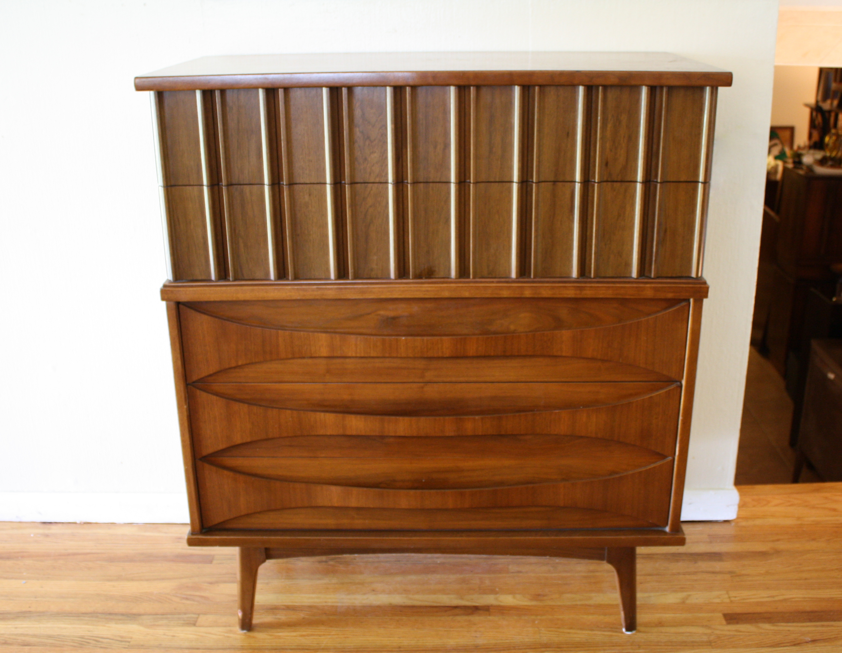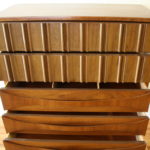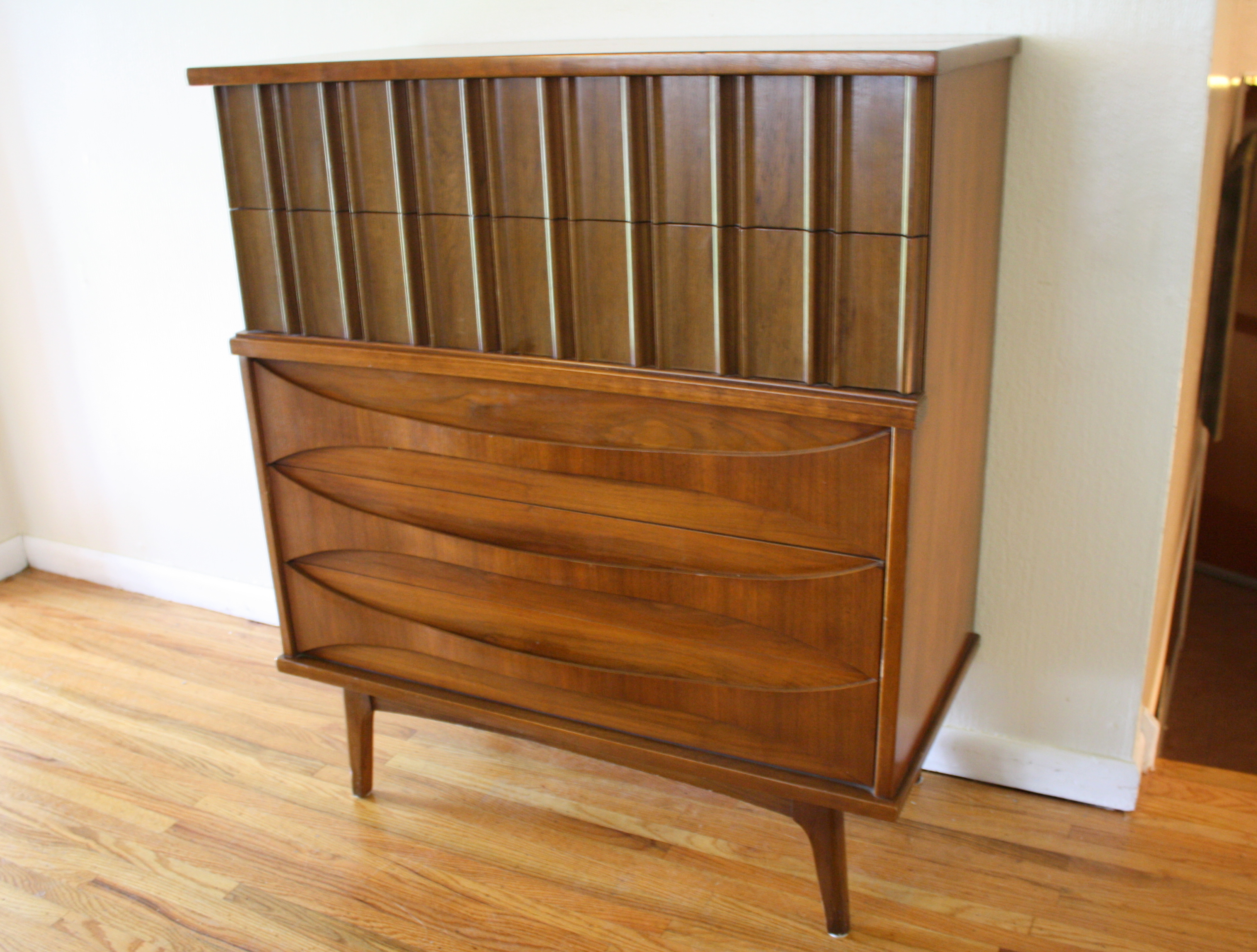 This is a mid century modern dresser with 5 sculpted dovetailed drawers.