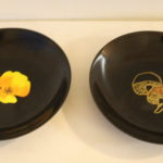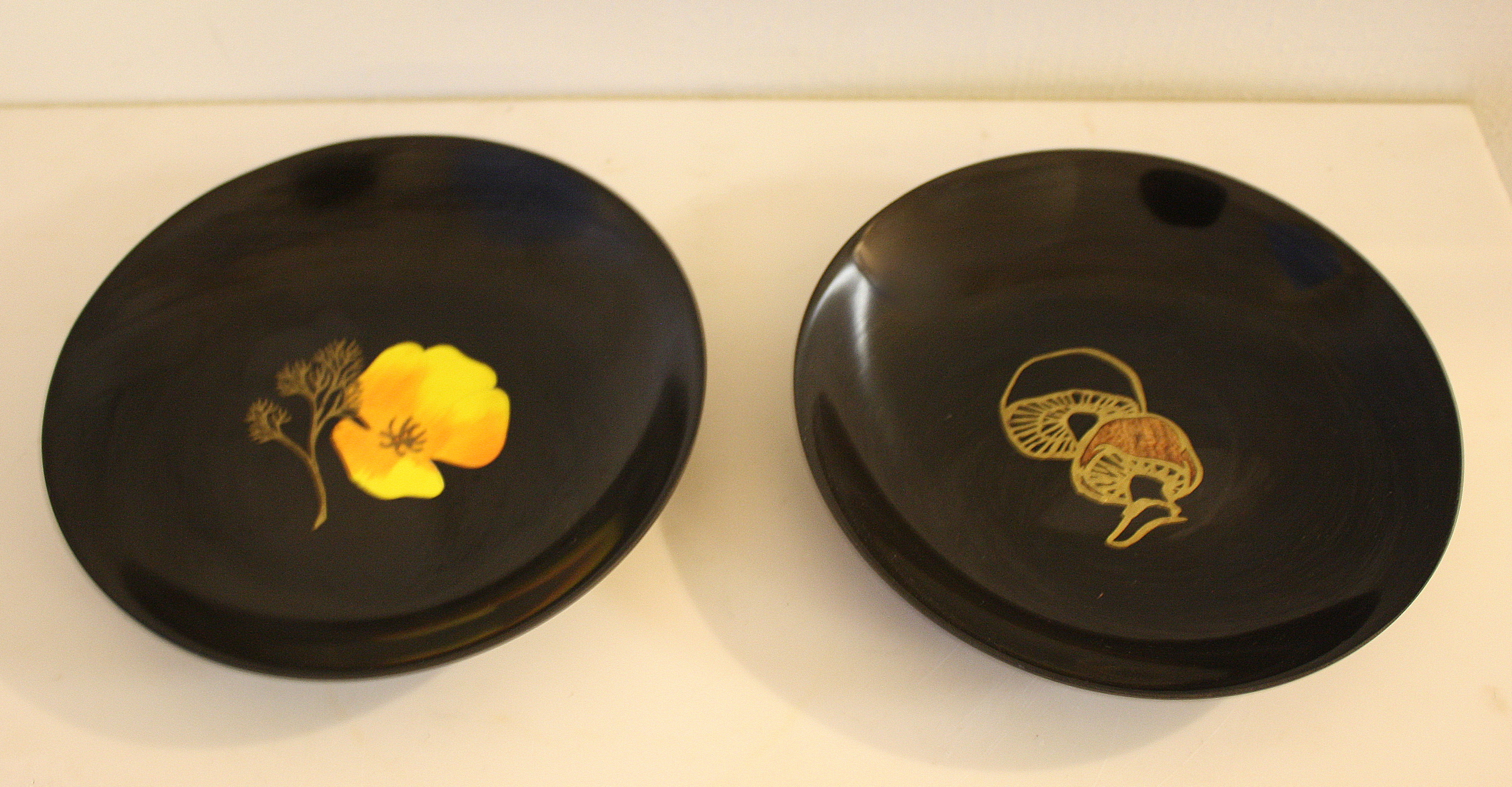 These are fun mid century modern Couroc serving pieces.  Reminiscent of San Francisco, this tray has inlaid design details of a trolley and seagulls.  Dimensions: 15.5″W x 10.5″D.  Also available are 2 Couroc bowls with design details of  flowers and mushrooms:  7.5″diameter.