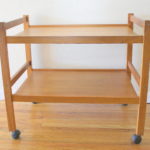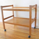 These are 2 mid century modern serving carts, The first is a mid century modern rolling serving cart with a turquoise formica top and bottom shelf. A perfect pop of color, can also be used as a side end table or planter stand. Dimensions: 25″W x 17″D x 24″H. The second is a Danish serving cart by B.R.D.R. Furbo, made in Denmark. It has 2 tiers, is made of teak, and is on wheels. Dimensions: 27″W x 18″D x 22″H. 1 of each available.