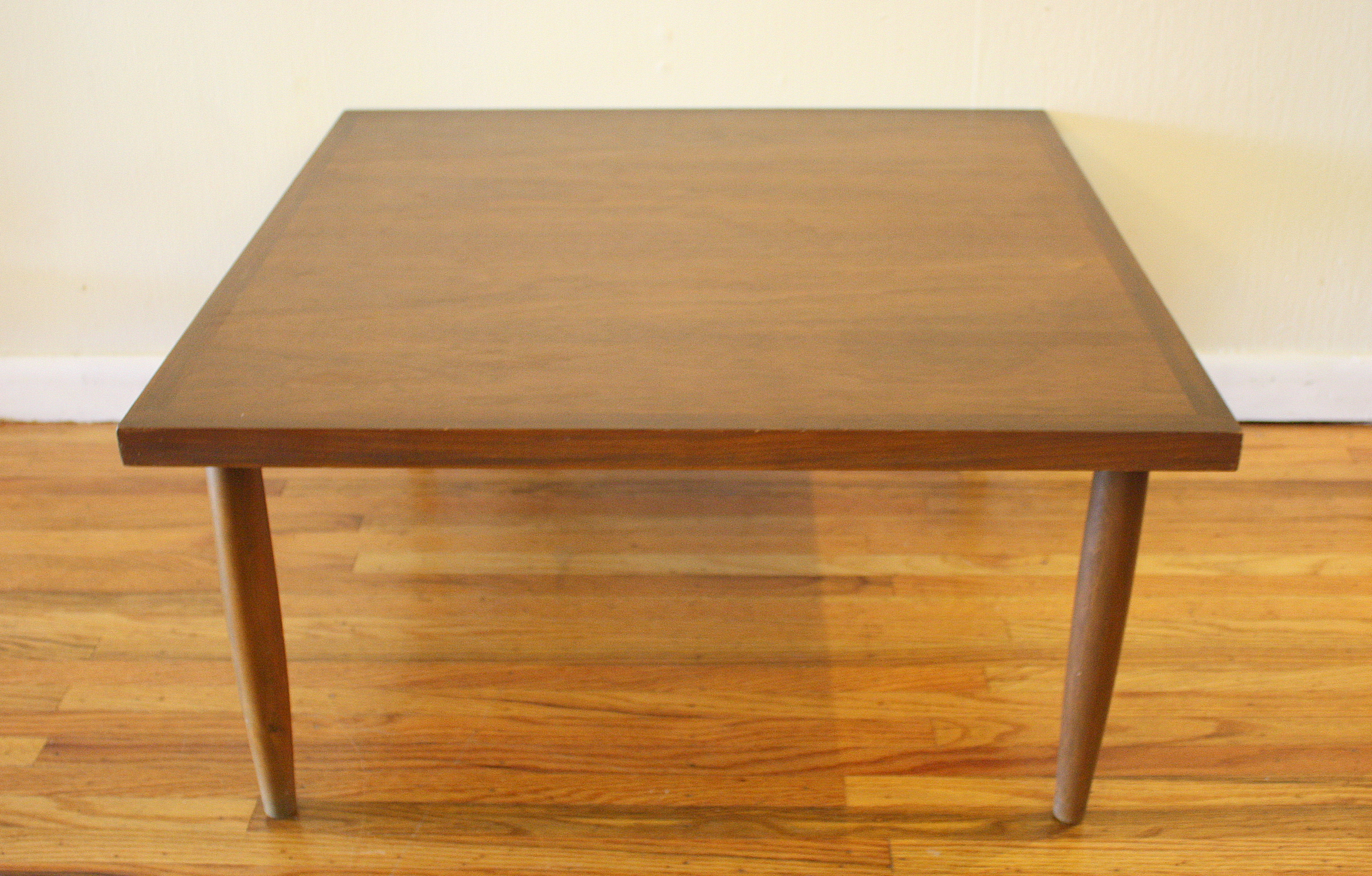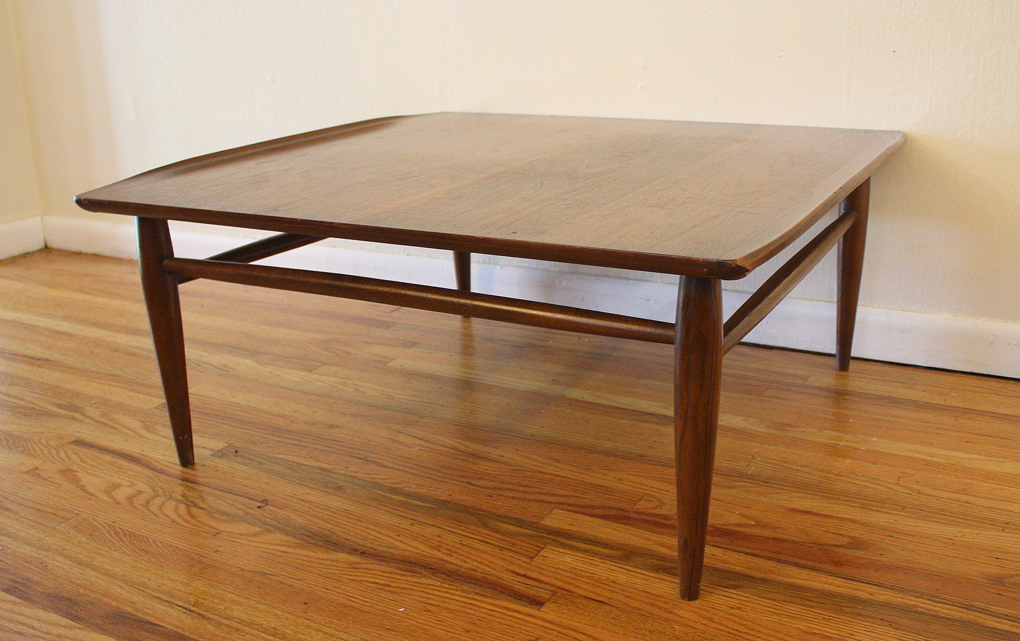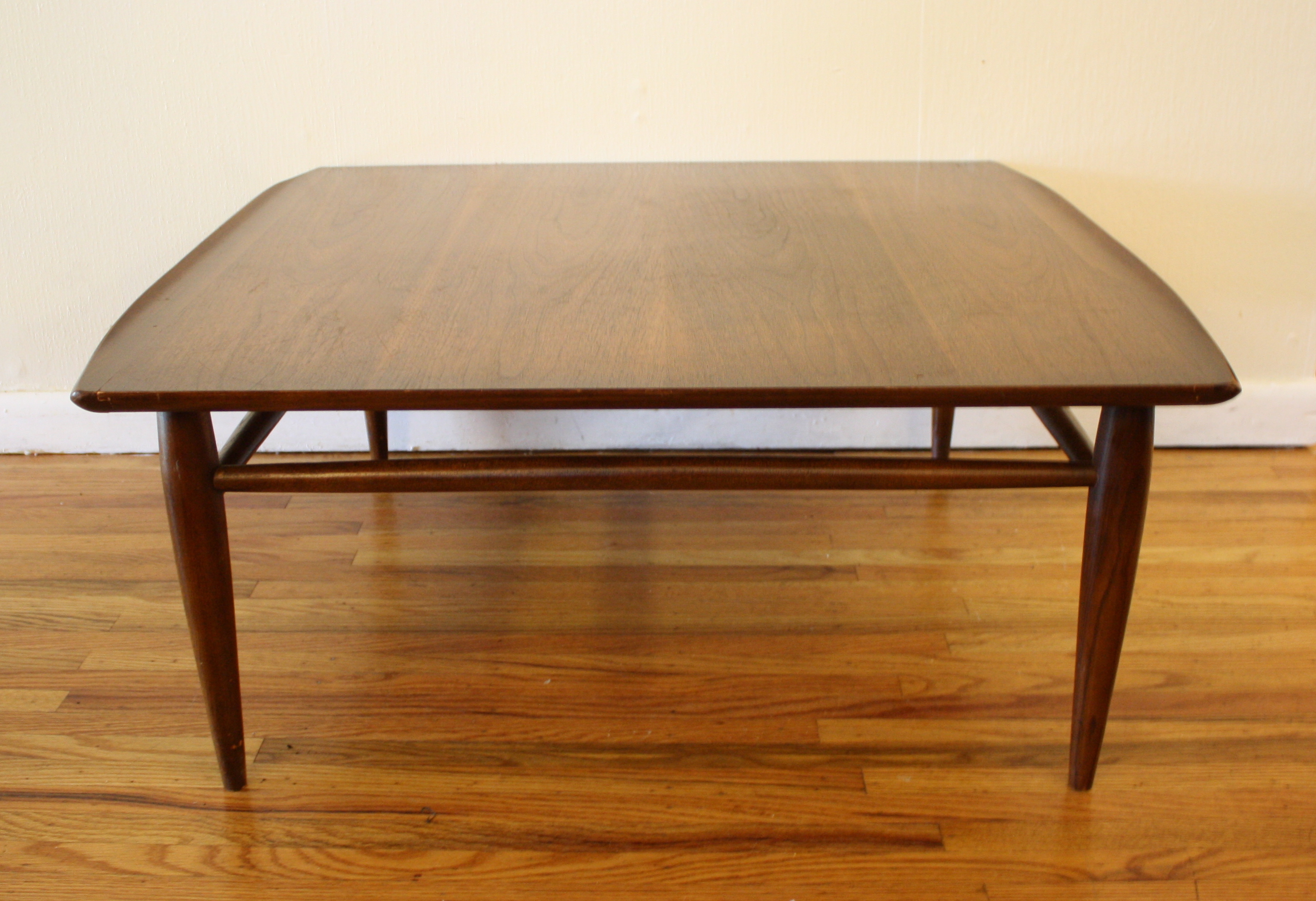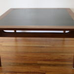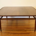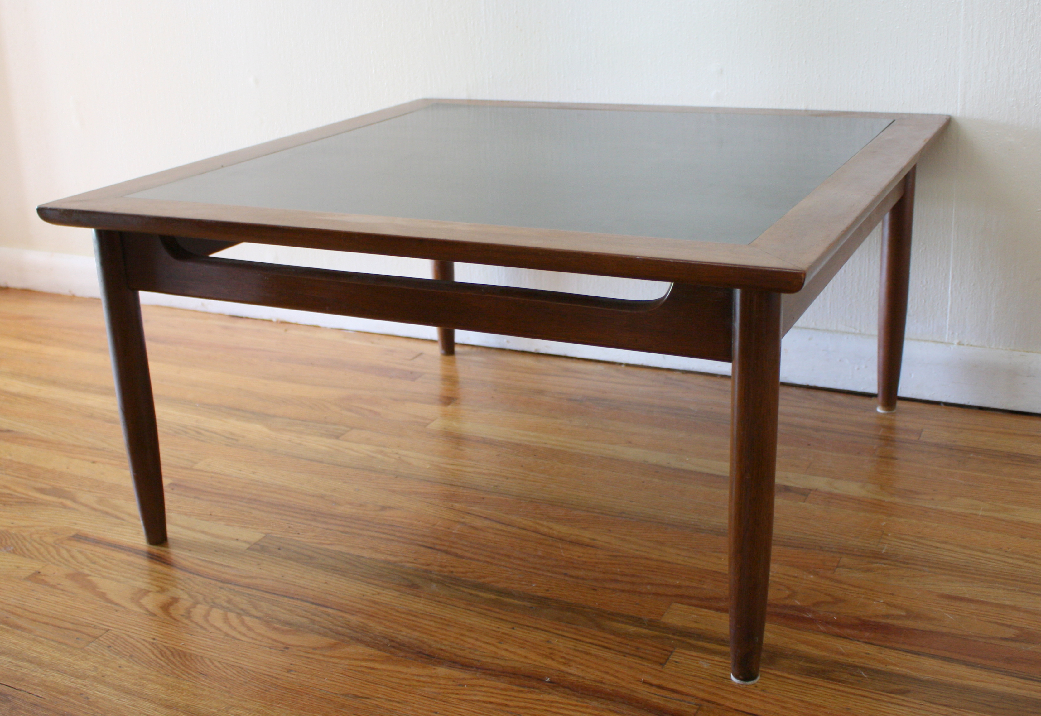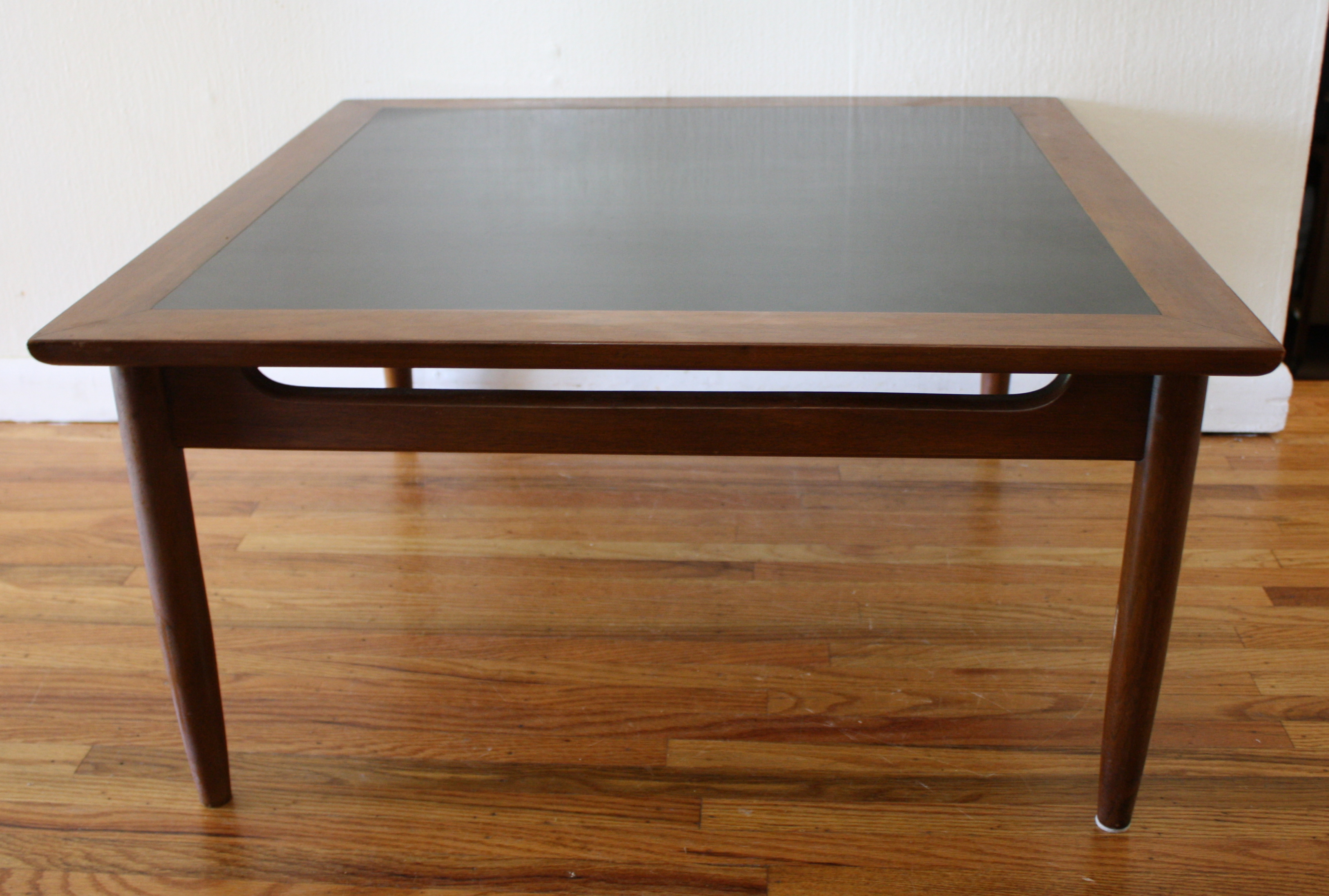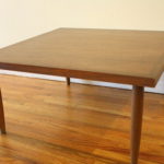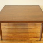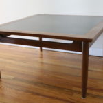 Here is a selection of our mid century modern square coffee tables. The first is a square coffee table with clean lines and perfect simple design. The second has a black formica top and sculpted base: 32″W x 32″D x 16″H. The third is our Bassett table with surfboard edges: 33″W x 32″D x 15″H.