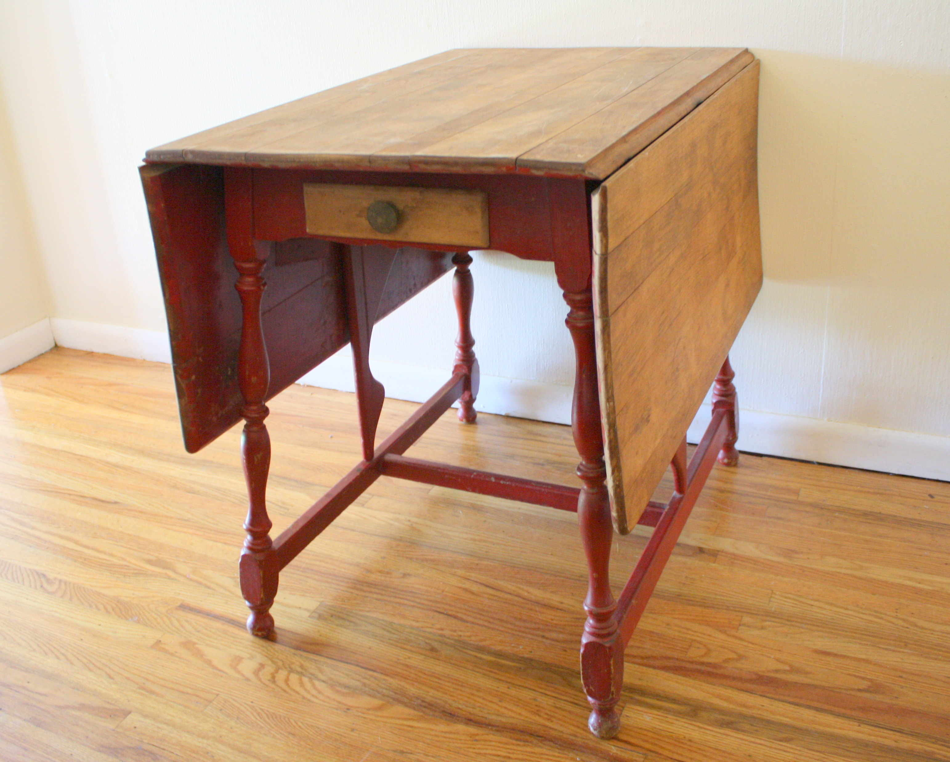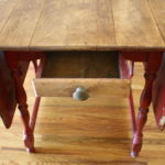 This antique farm table has a beautiful patina and rustic look. It’s solid wood top has gorgeous wear, 2 folding leaves, and sits on top of a painted solid wood base. There is a small cute drawer. Dimensions: 23″W leaves down, 53″W both leaves up, 33″D, 29″H.