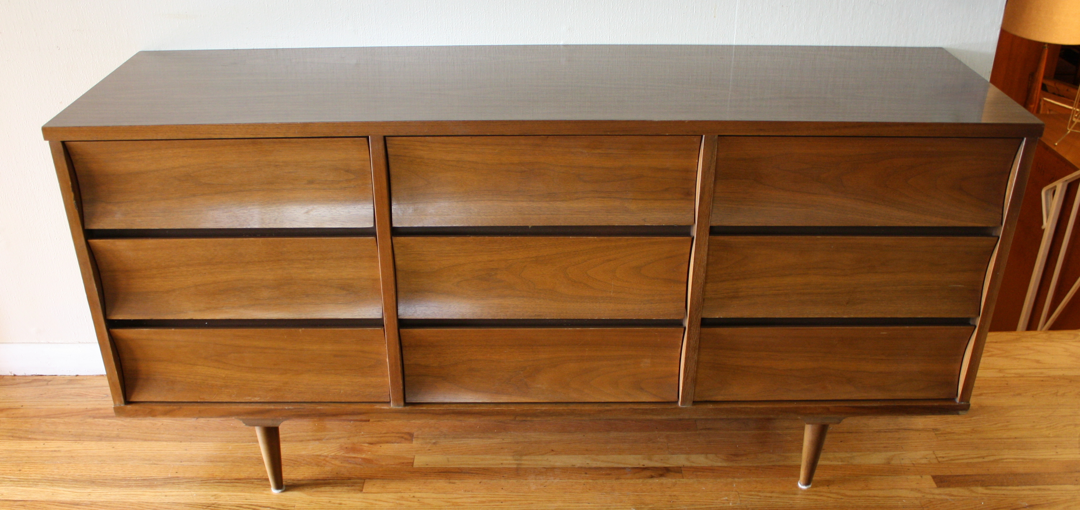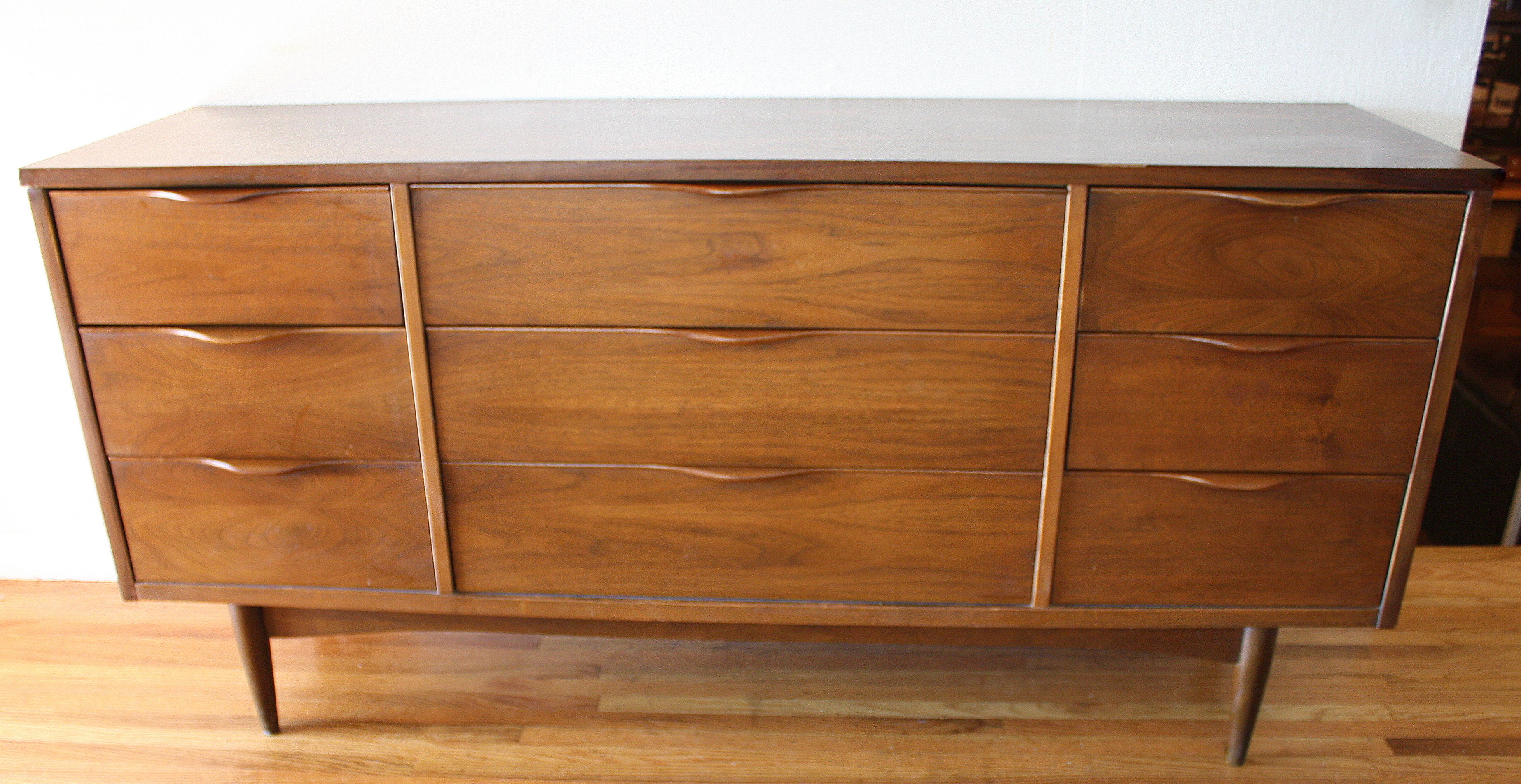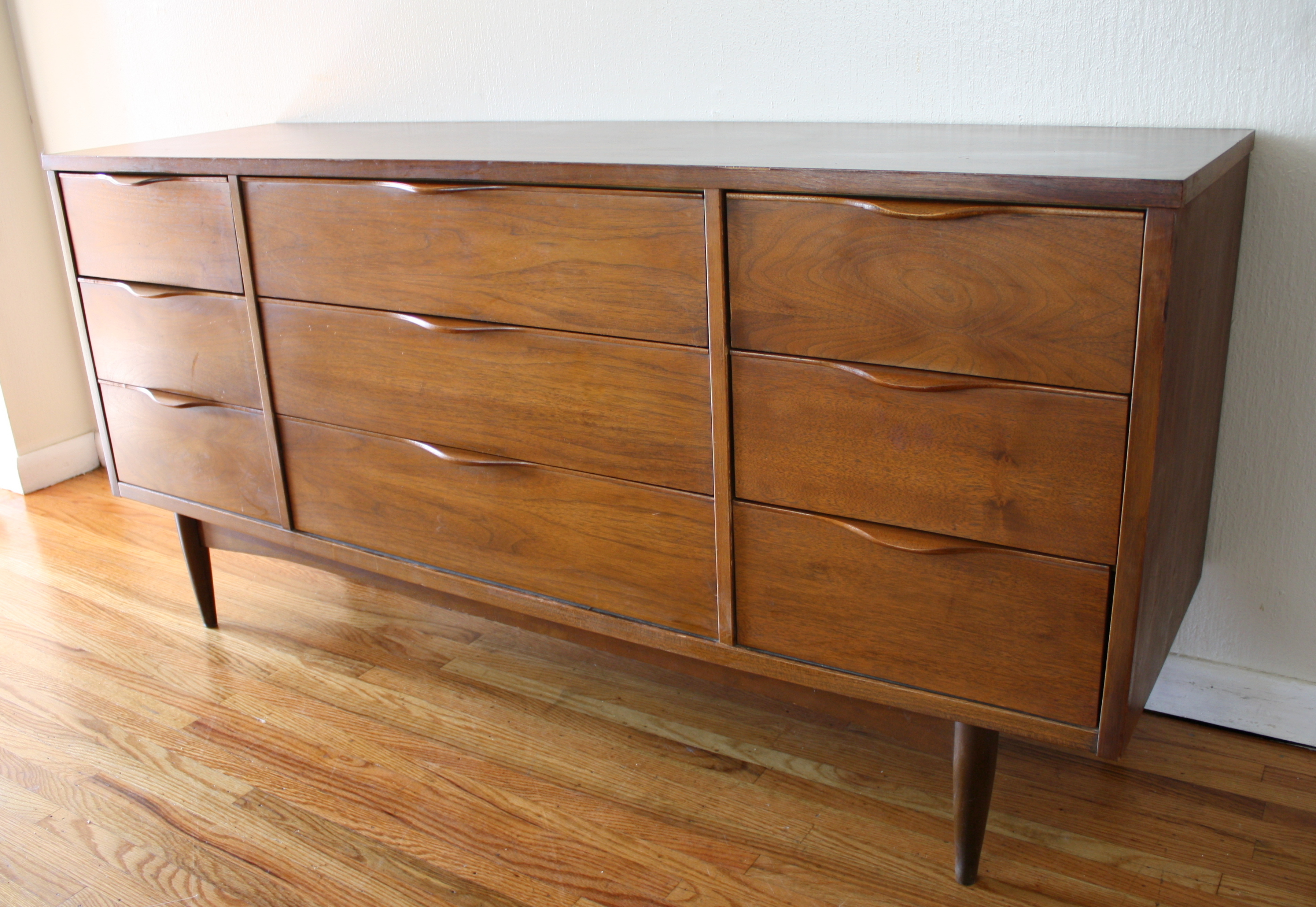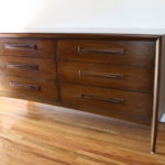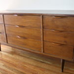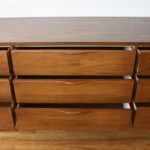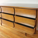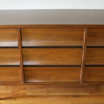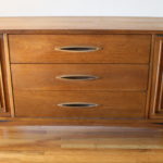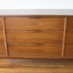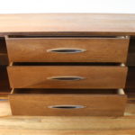 Here is a new selection of mid century modern credenza low dressers. We have a Broyhill Sculptra credenza with 2 sculpted side cabinets and 3 dovetailed drawers: 58″W x 17″D x 28.5″H, a mid century modern credenza with six drawers: 60″W x 19″D x 30.5″H, a Johnson Carper low dresser credenza with concave drawers: 62″W x 18″D x 30″H, and a mid century modern credenza with 9 drawers with architectural drawer pulls.