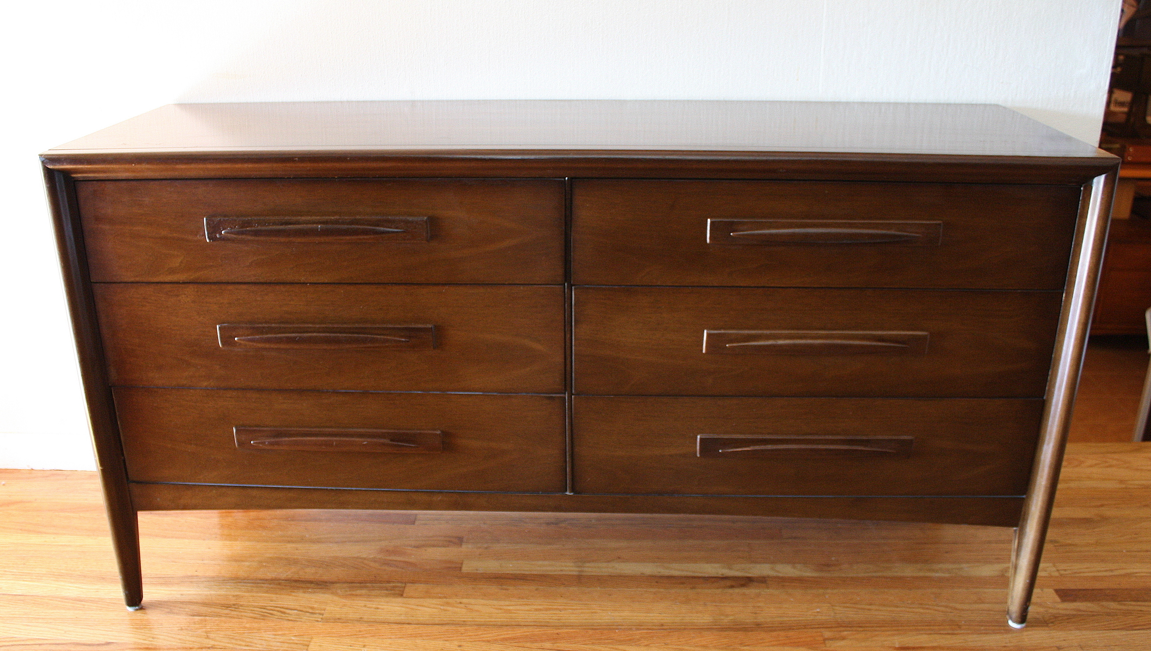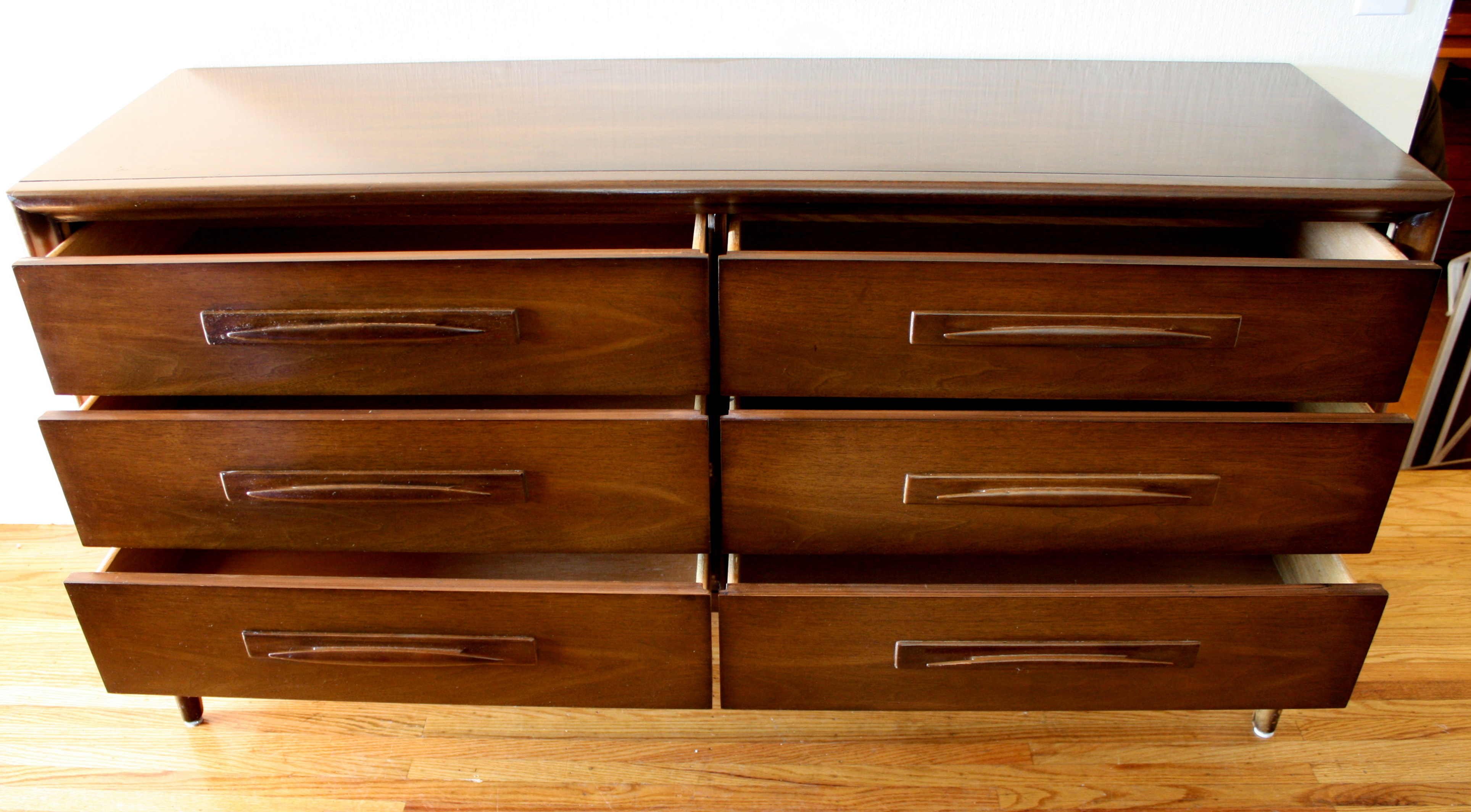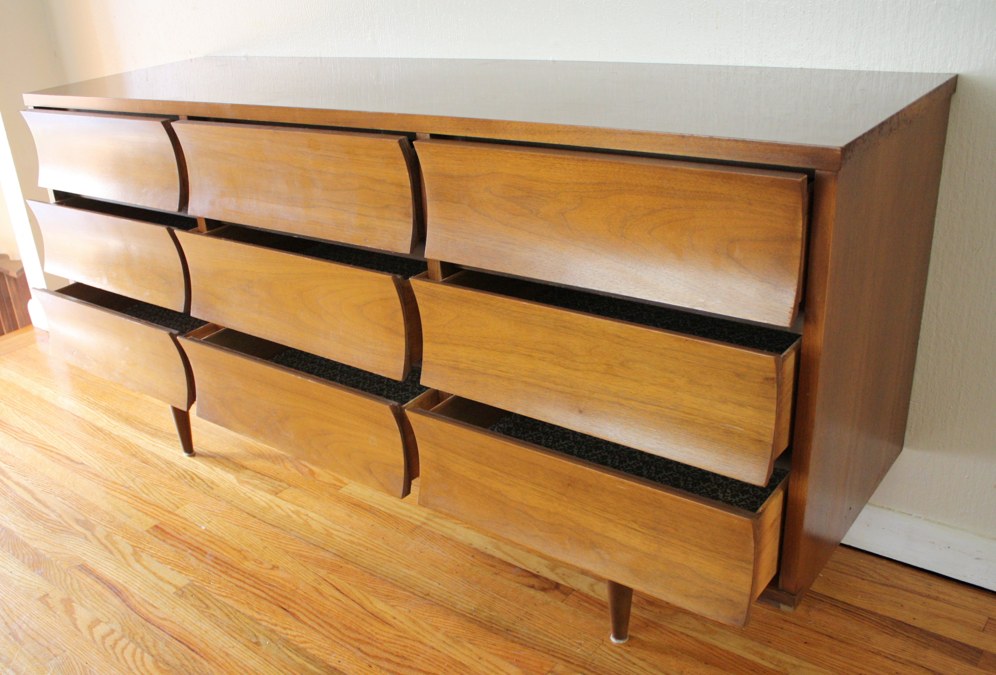 Here is a new selection of mid century modern credenza low dressers. We have a Broyhill Sculptra credenza with 2 sculpted side cabinets and 3 dovetailed drawers: 58″W x 17″D x 28.5″H, a mid century modern credenza with six drawers: 60″W x 19″D x 30.5″H, a Johnson Carper low dresser credenza with concave drawers: 62″W x 18″D x 30″H, and a mid century modern credenza with 9 drawers with architectural drawer pulls.