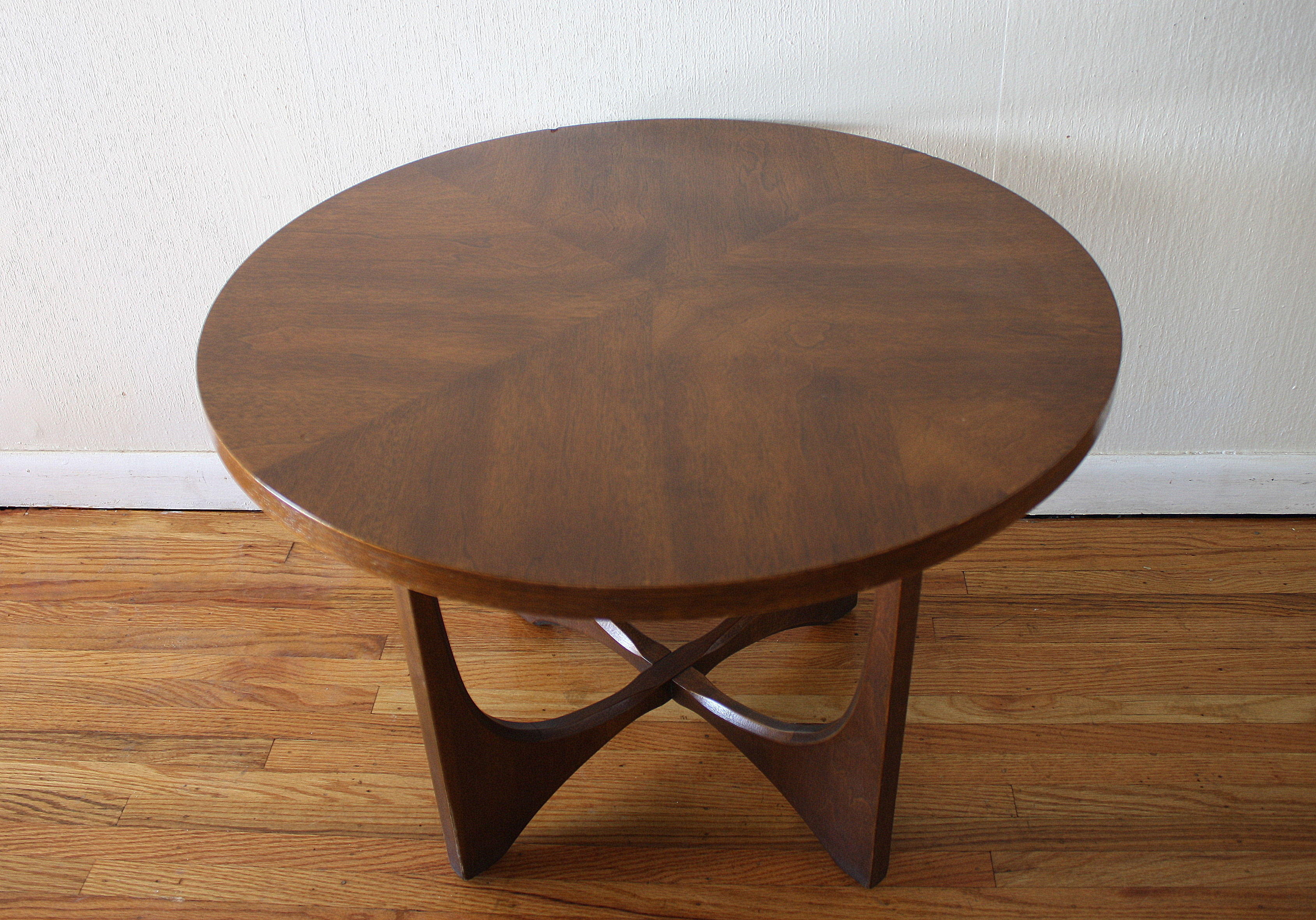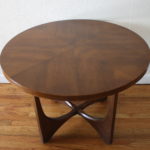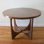 This is a mid century modern side end table from the Broyhill Brasilia line.  It is made of solid wood and has their signature sculpted arched base.  Dimensions: 26″diameter x 20″H.