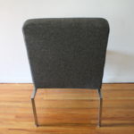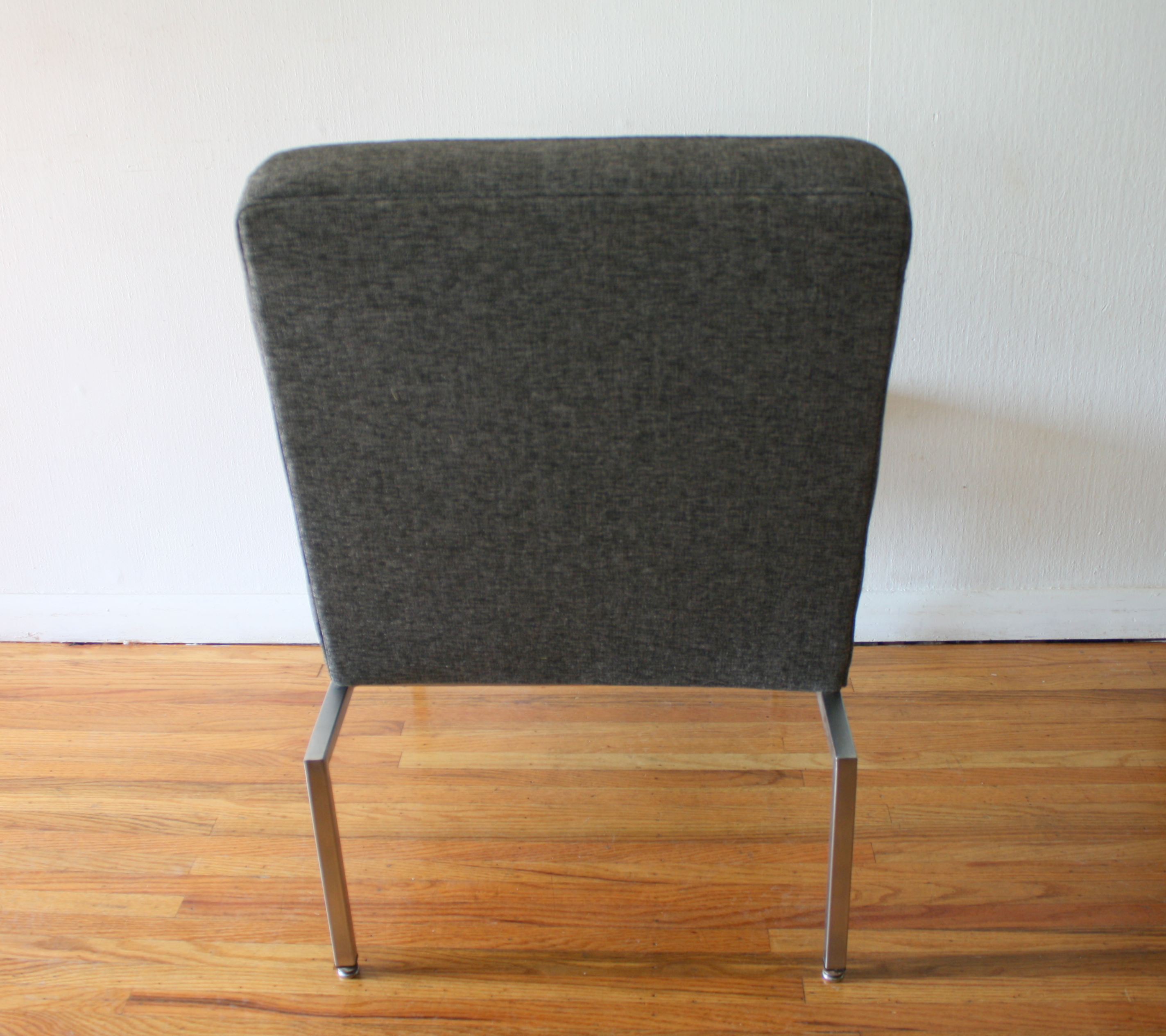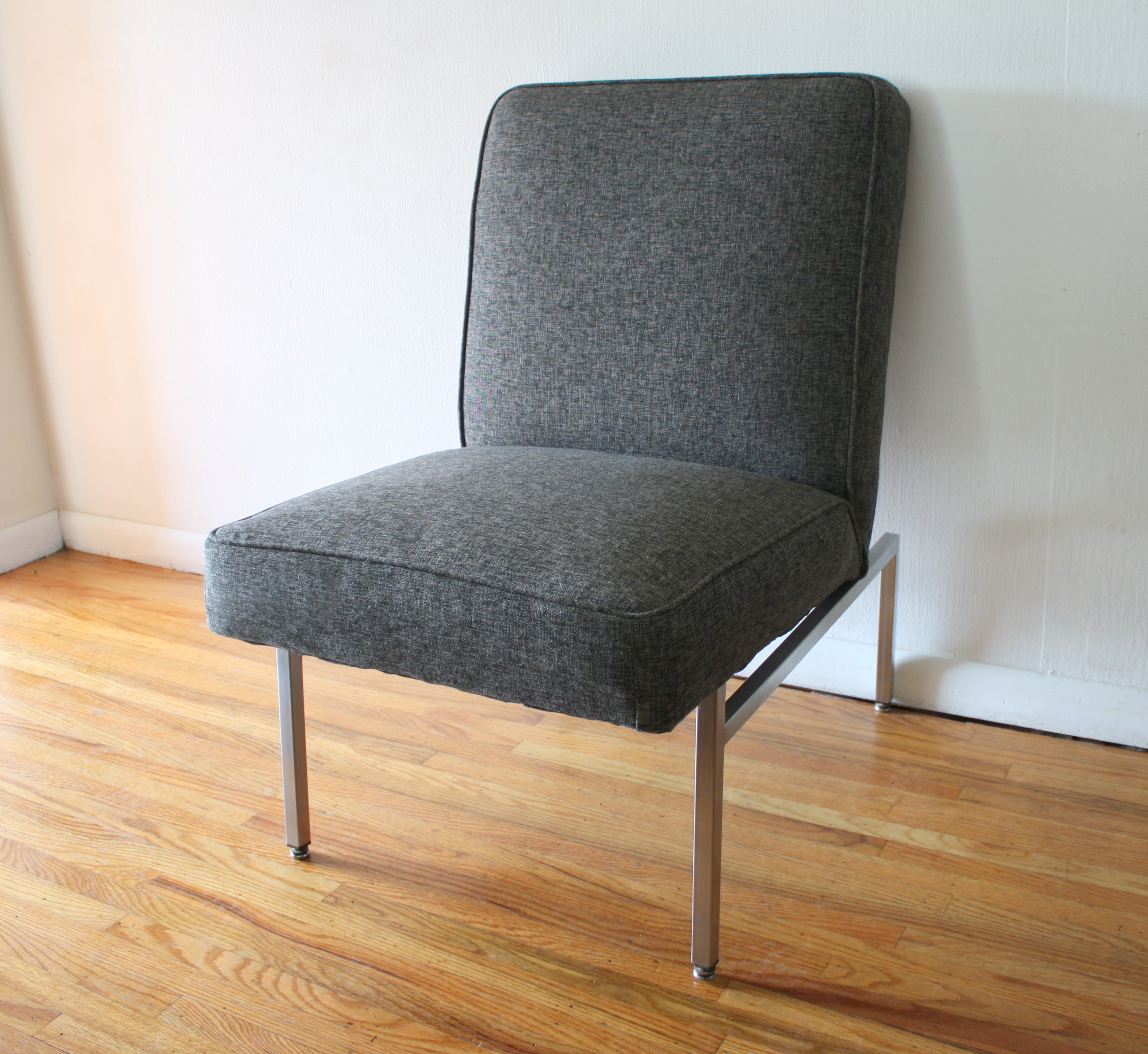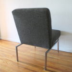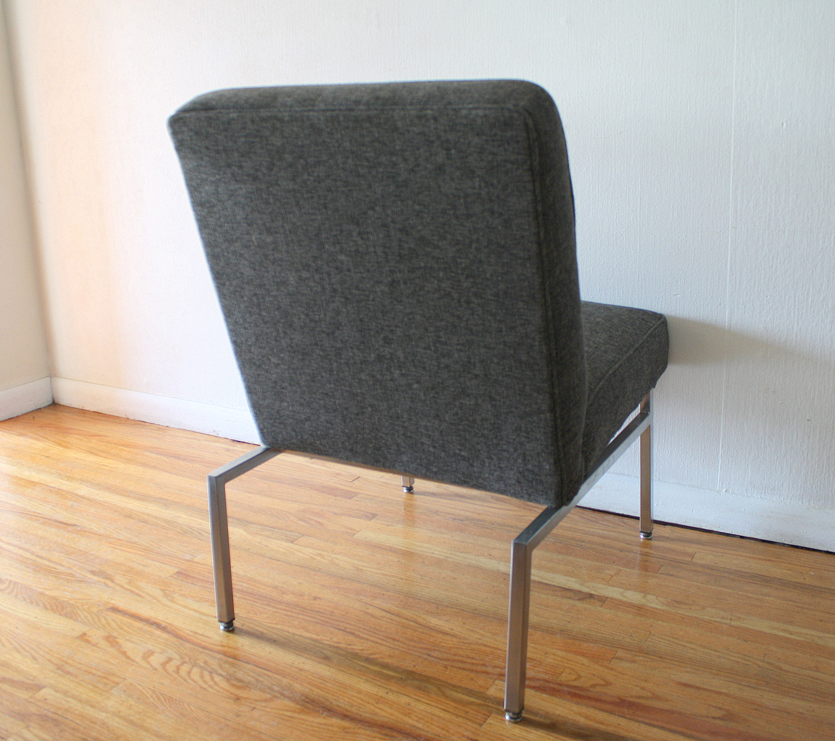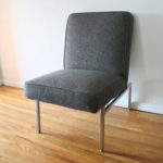 This is a mid century modern lounge chair.  It is upholstered in a charcoal gray tweed and has a metal base.  Dimensions: 22.5″ seat width, 19.5″ seat depth x 18″ seat height x 34″ back height.
