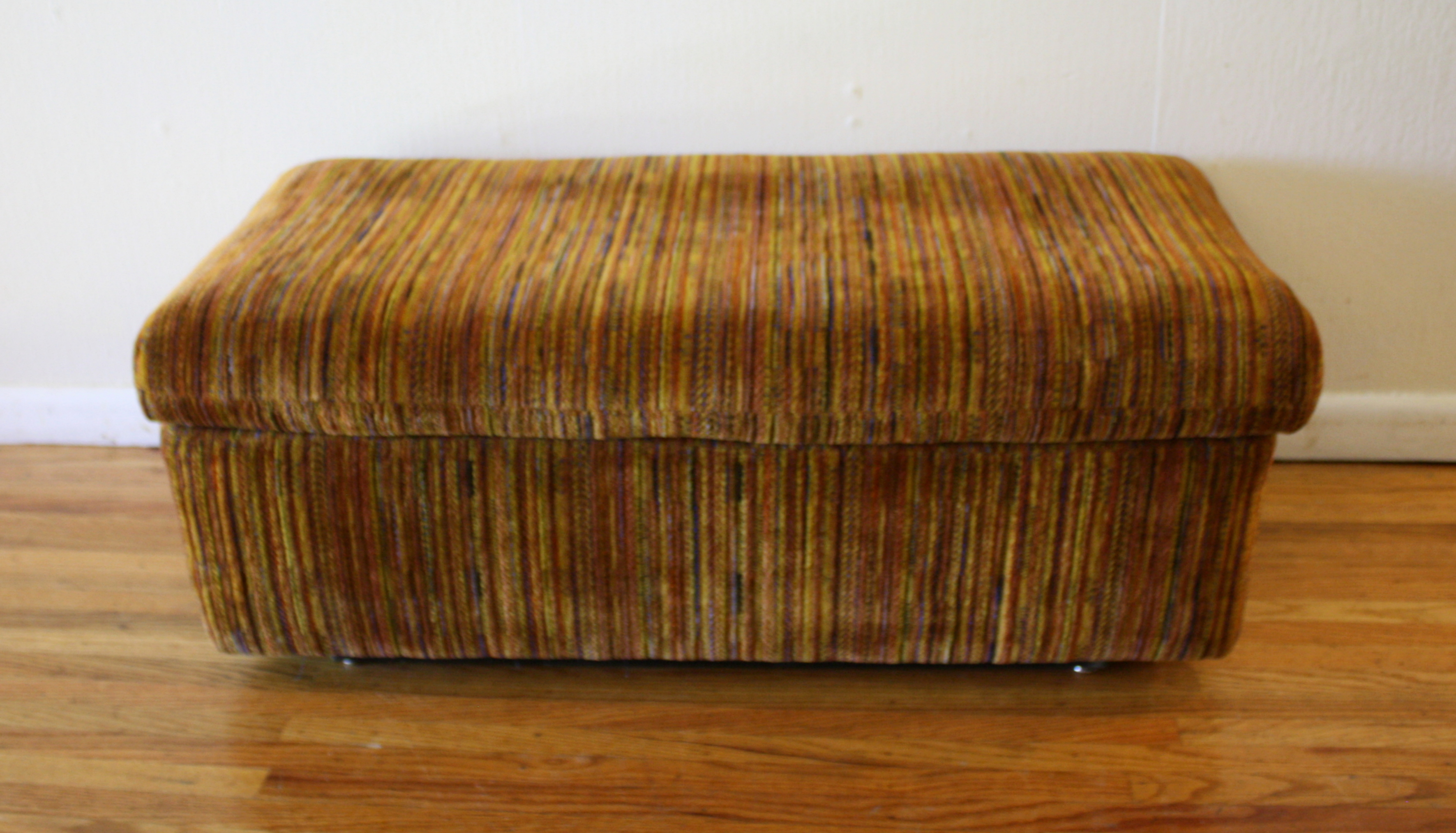 These are 2 rolling mid century modern bench ottoman upholstered in a soft polychromatic velvet.  Dimensions:  41.5″W xx 21″D x 15″H.