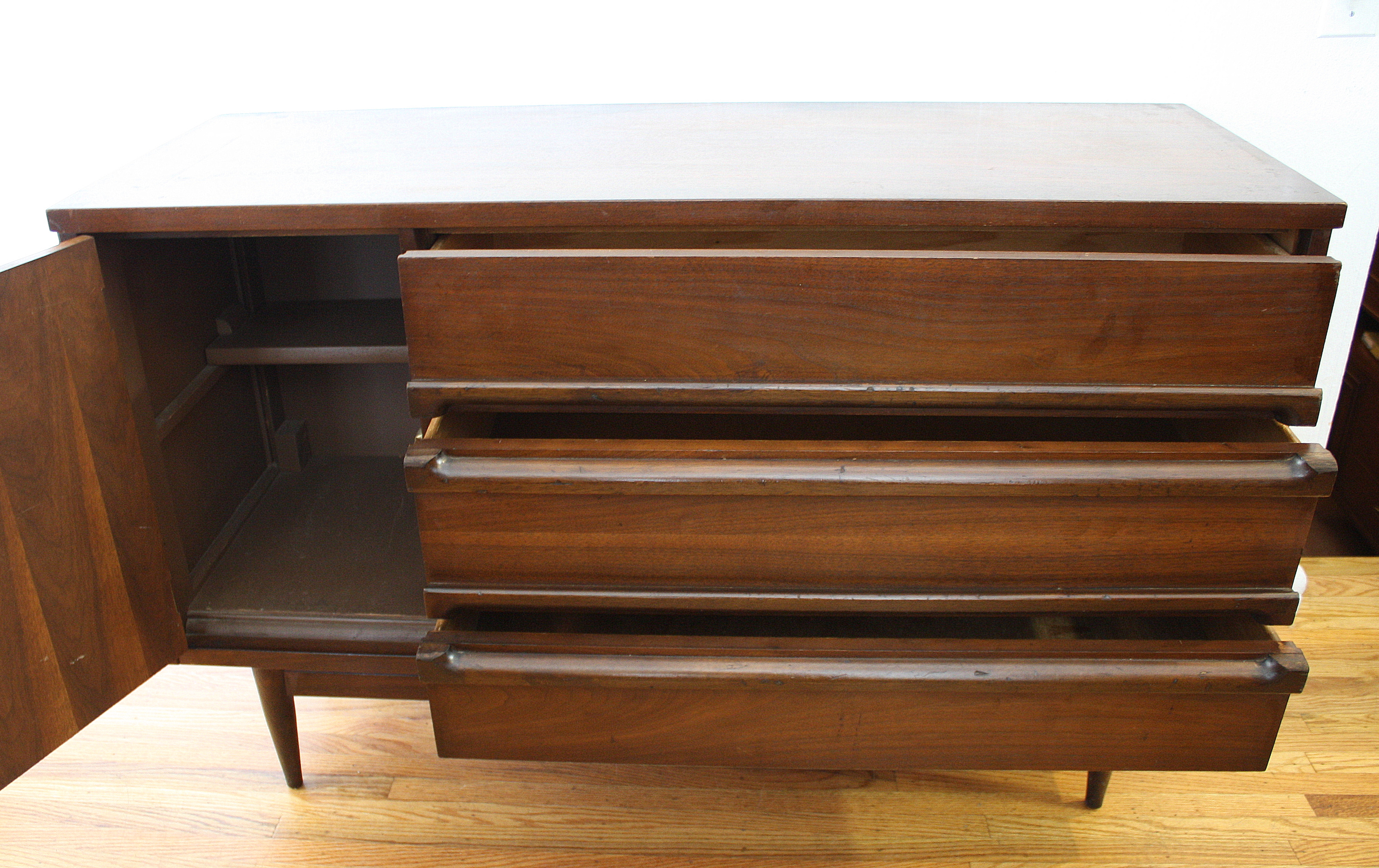 These are 2 mid century modern credenzas. The first credenza is by Stanley, has 2 side cabinets with sculpted doors and 3 dovetailed drawers with carved wood handles. The top has an interesting cut out notched top design that compliments the sculpted drawers: 56″W x 19.5″D x 32″H. The second credenza by Bassett has 1 side cabinet, 3 dovetailed drawers with a streamlined design, and tapered legs: 48″W x 18″D x 30″H.