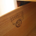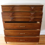 This is a mid century modern tall dresser from the Kent Coffey Perspecta collection. It has their signature carved arches in the drawer pulls, 5 dovetailed drawers, and sculpted legs. Dimensions: 40″W x 19″D x 15″H.