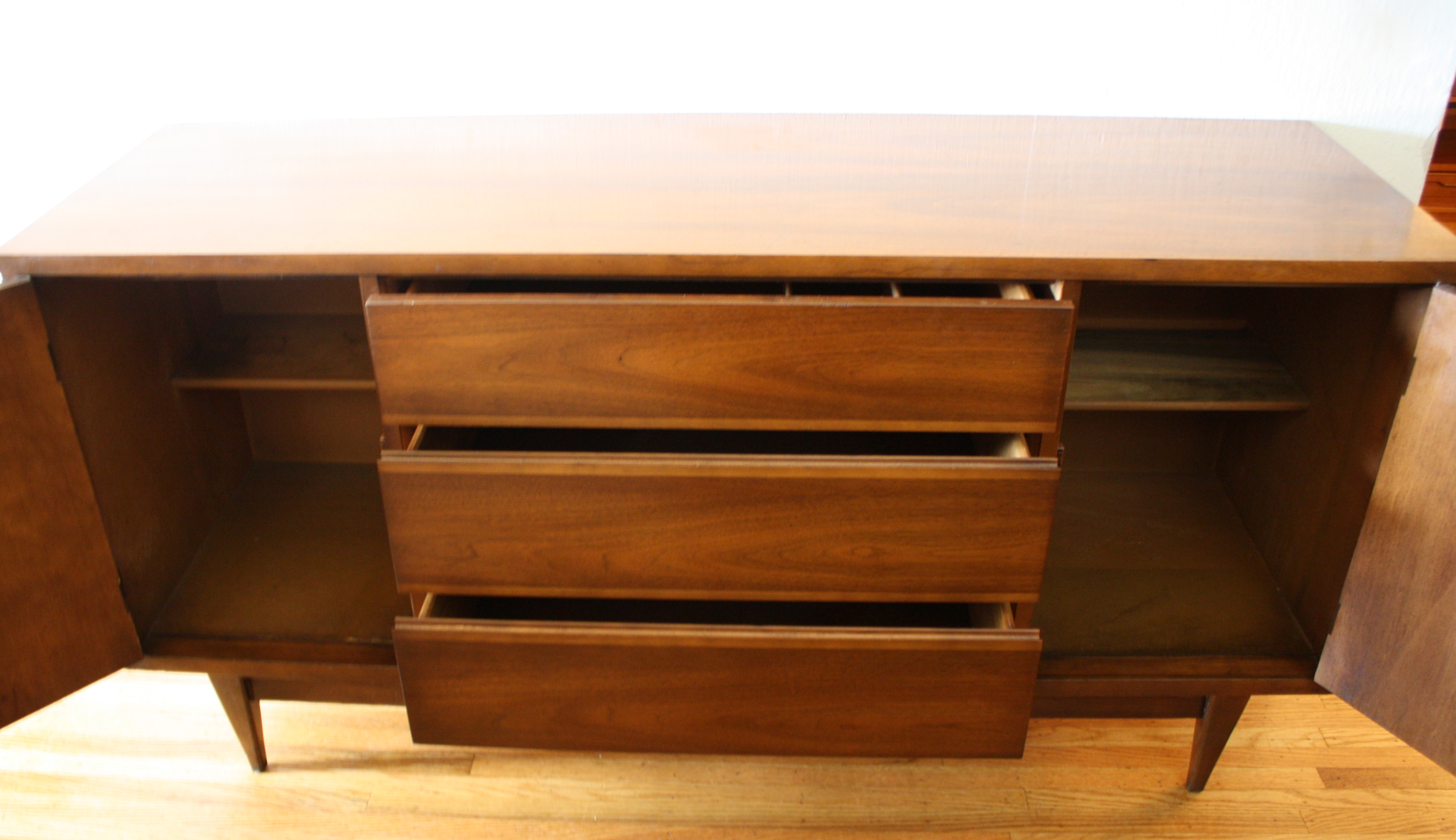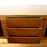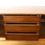 These are 2 mid century modern credenzas with side cabinets. The first mid century modern credenza has 3 dovetail drawers with a streamlined drawer design, and 2 side cabinets brass handles and shelves: 59″W x 18.5″D s 30″H. The second mid century modern credenza has a slatted design, 3 dovetail drawers with a streamlined drawer design, and 2 side cabinets with shelves: 62″W x 19″D x 30″H.