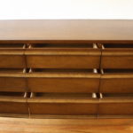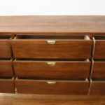 These are 2 different styles of mid century modern low dresser credenzas by Bassett.  The first has 9 dovetailed drawers with a streamlined design: 60″W x 18″D x 30″H.  The second 9 drawer dresser has curved brass handles: 60″W x 18″D x 30″H.