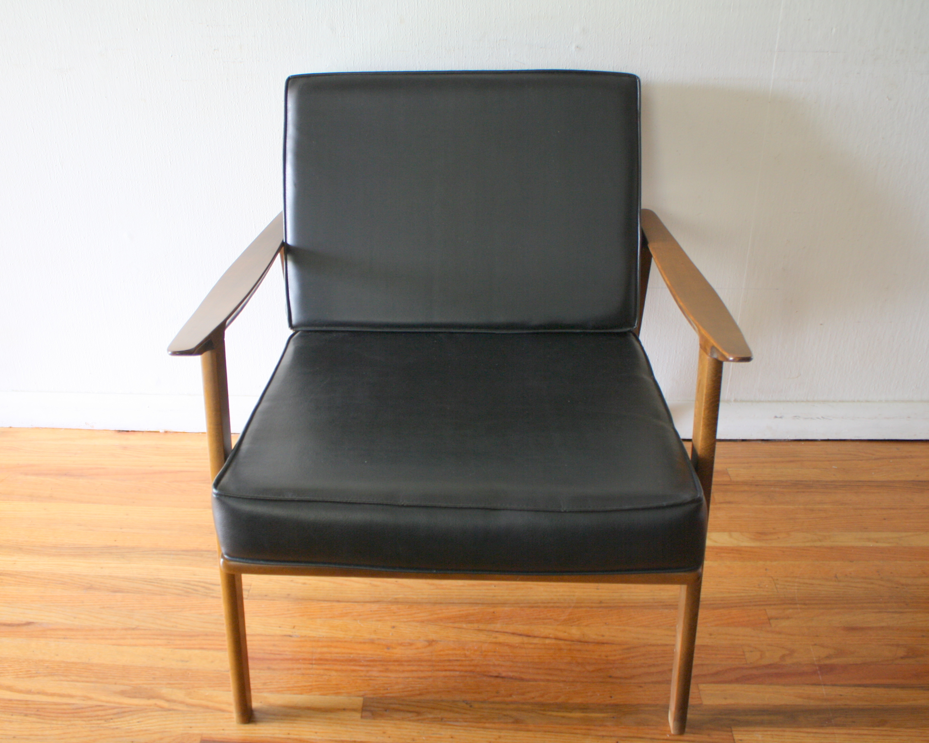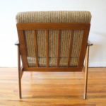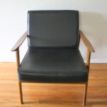 These are 2 mid century modern Hans Wegner style arm lounge chairs with solid wood frames and cushions. The first has black naugahyde cushions, the second chair has eggshell tweed cushions. The frames have slatted backs and beautiful curved arms. Dimensions of black chair: seat width: 20″, seat depth: 20″, seat height: 18″, 30″ back height. Dimensions of eggshell chair: seat width: 23″, seat depth: 23″, seat height: 16″, 30″ back height.