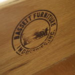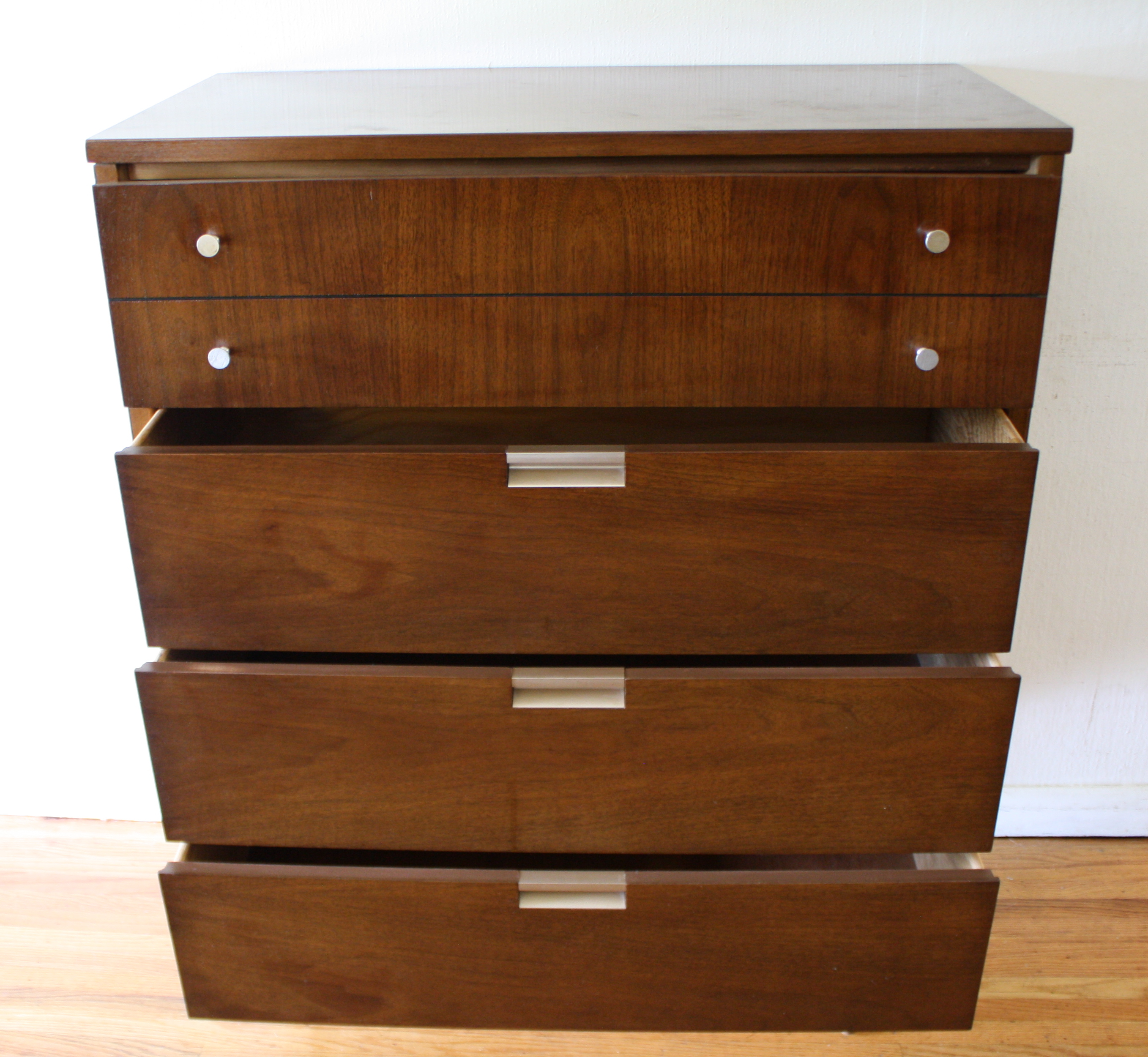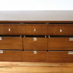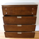 These are 2 mid century modern dressers by Bassett. Each dresser has silver knobs and angled handles. The tall dresser has 4 dovetailed drawers: 34″W x 18″D x 43″H. The low dresser has 9 dovetailed drawers: 60″W x 18″D x 30″H.