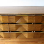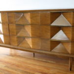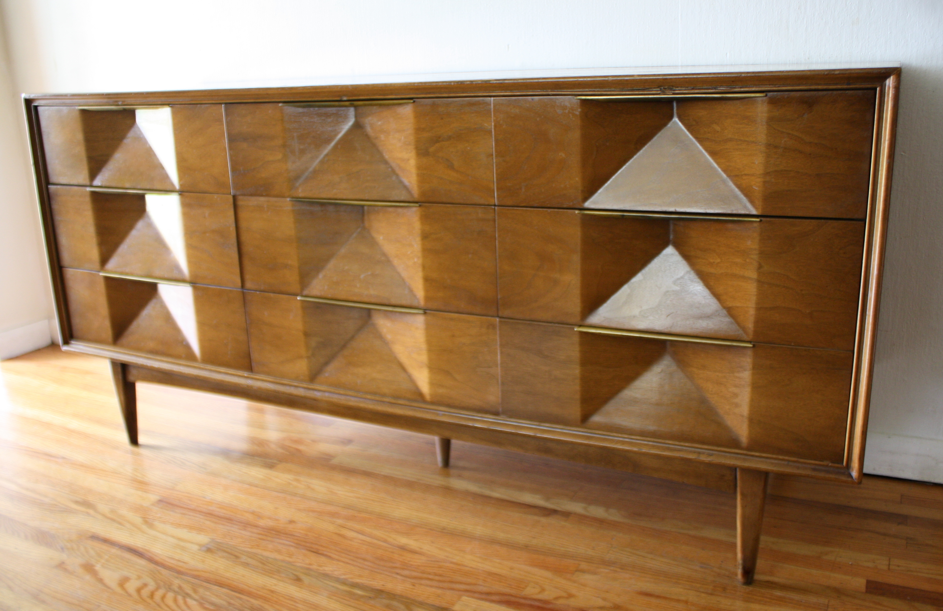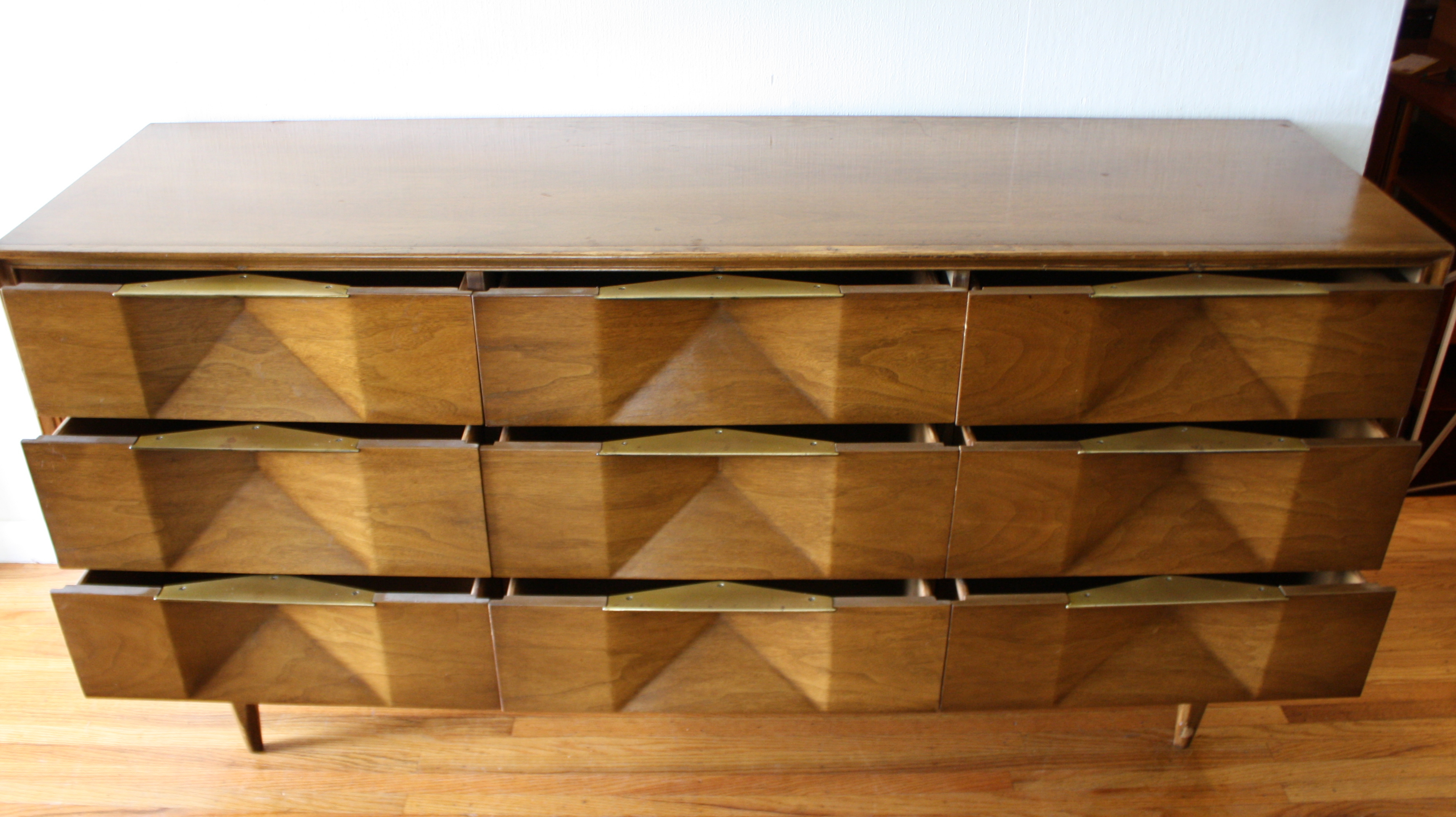 This is a selection of mid century modern low dresser credenzas that we recently sold with 9 dovetailed drawers and tapered legs. The first has a geometric concave drawer design with brass handles. The second is by United, and has a streamlined drawer design with brass handles. The third is by Coleman, and has solid wood handles with an angled design.