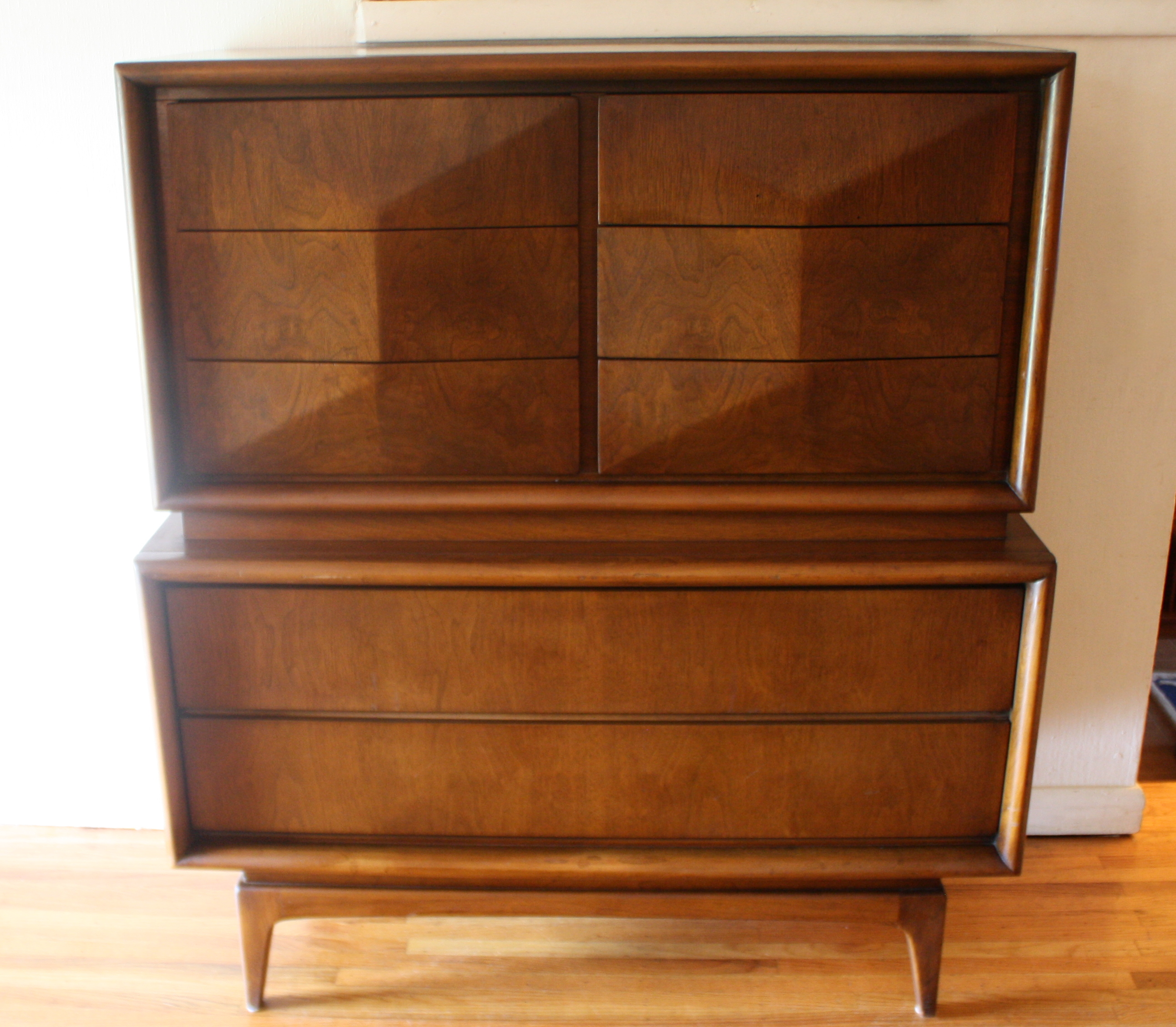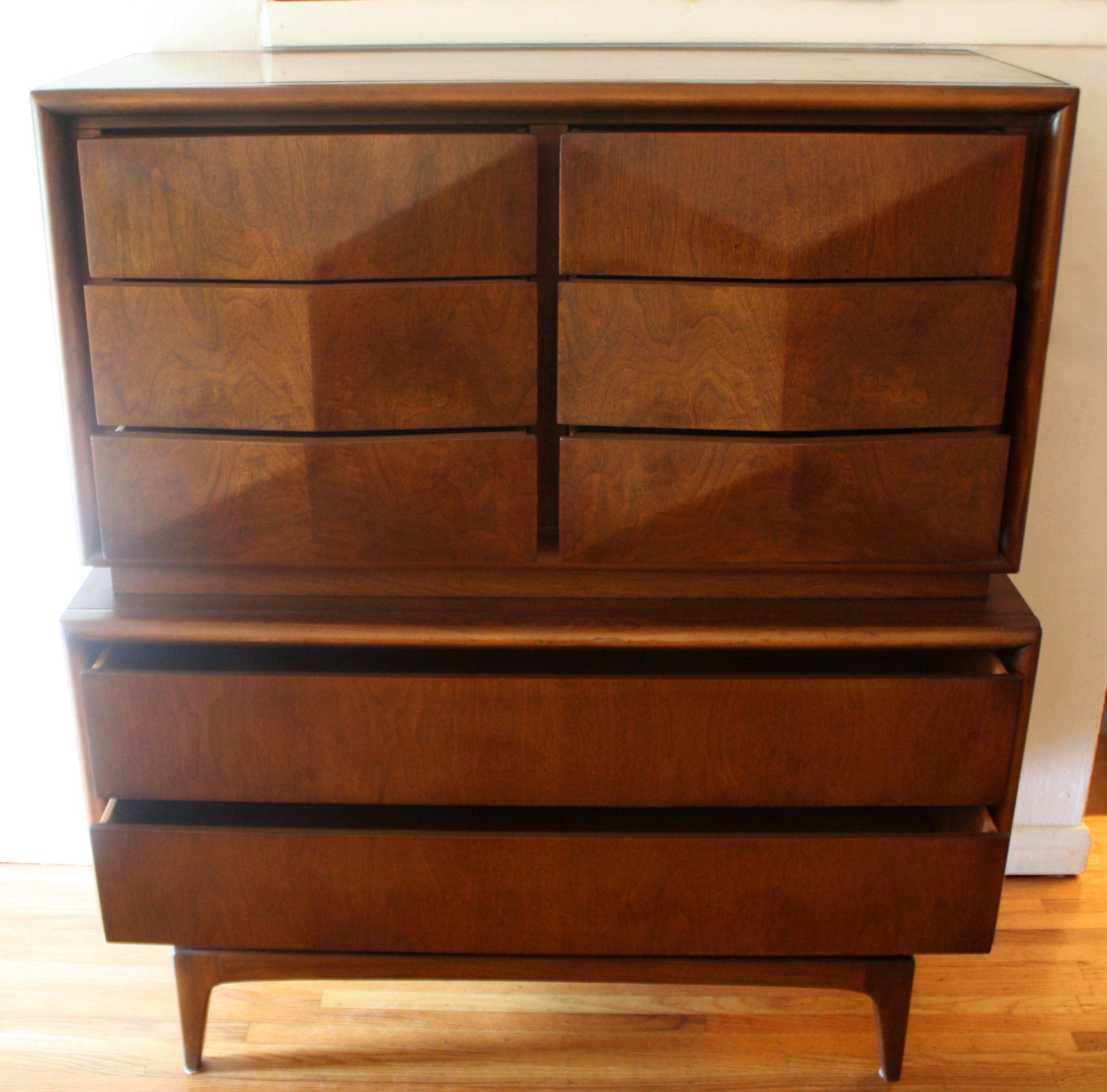 Mid Century Modern Armoire Tall Dresser by United This is a mid century modern armoire dresser by United. It has a gorgeous cube design in the drawers. It has 8 dovetailed drawers and tapered legs. Dimensions: 44″W x 20″D x 50″H. *SOLD* Leave a Reply Cancel replyYour email address will not be published. Required fields are marked *Comment * Name * Email * Website Save my name, email, and website in this browser for the next time I comment.